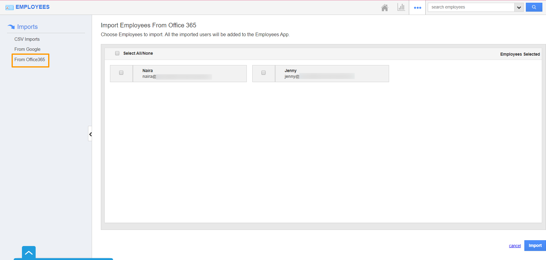 - The list of employees present in Office 365 will load in the right panel. Multiselect the employees and select Import.