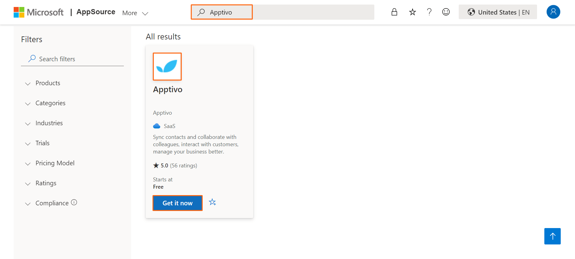 - You need to install the Apptivo App from the Microsoft App Source to start syncing Emails. Go to Microsoft App Source, search for Apptivo from the search bar, and hit the Get it now button as shown below.