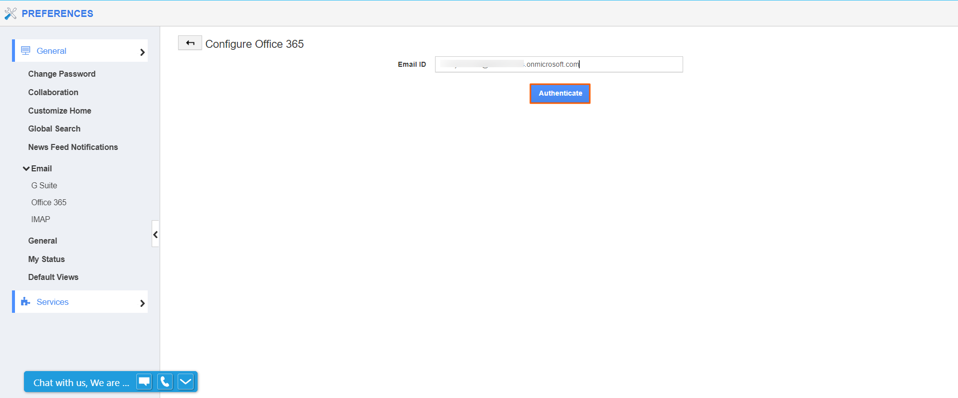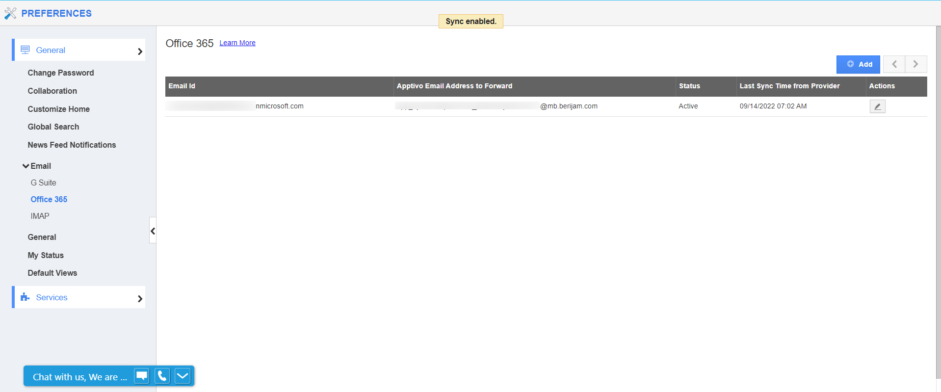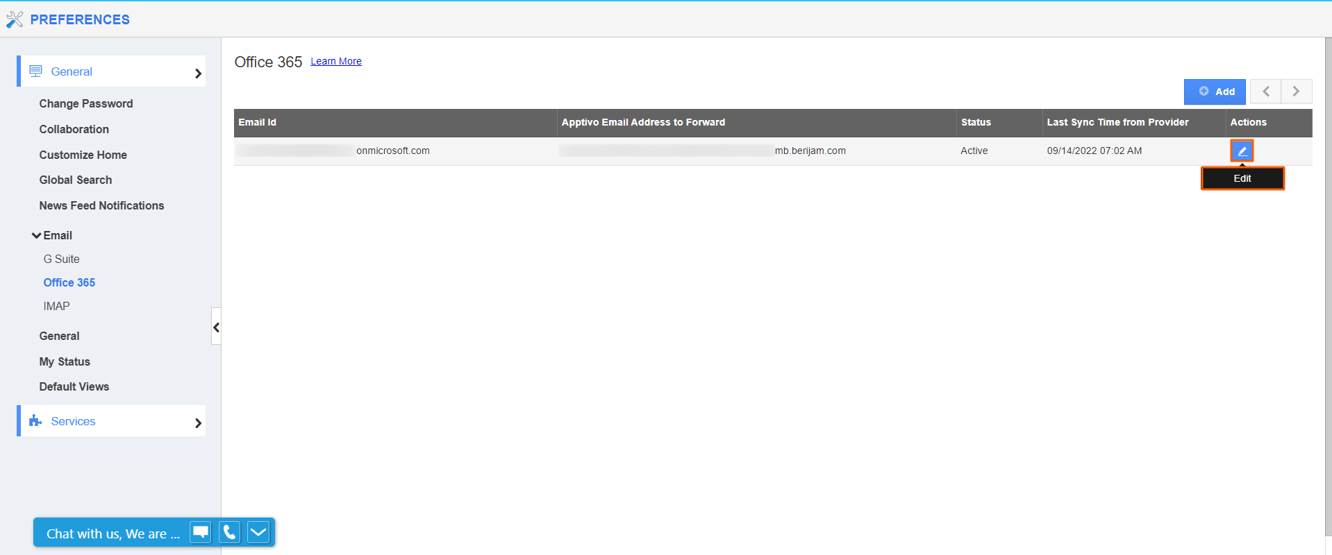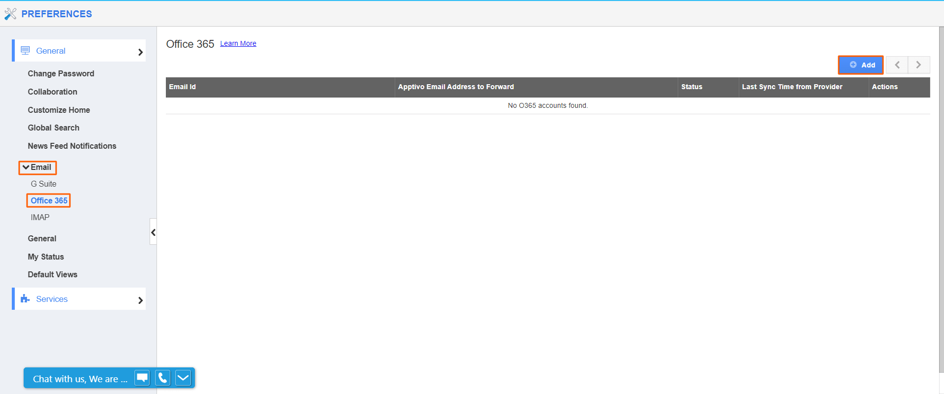 - On the preferences page, go to General → Email → Office365 and click on the Add button.