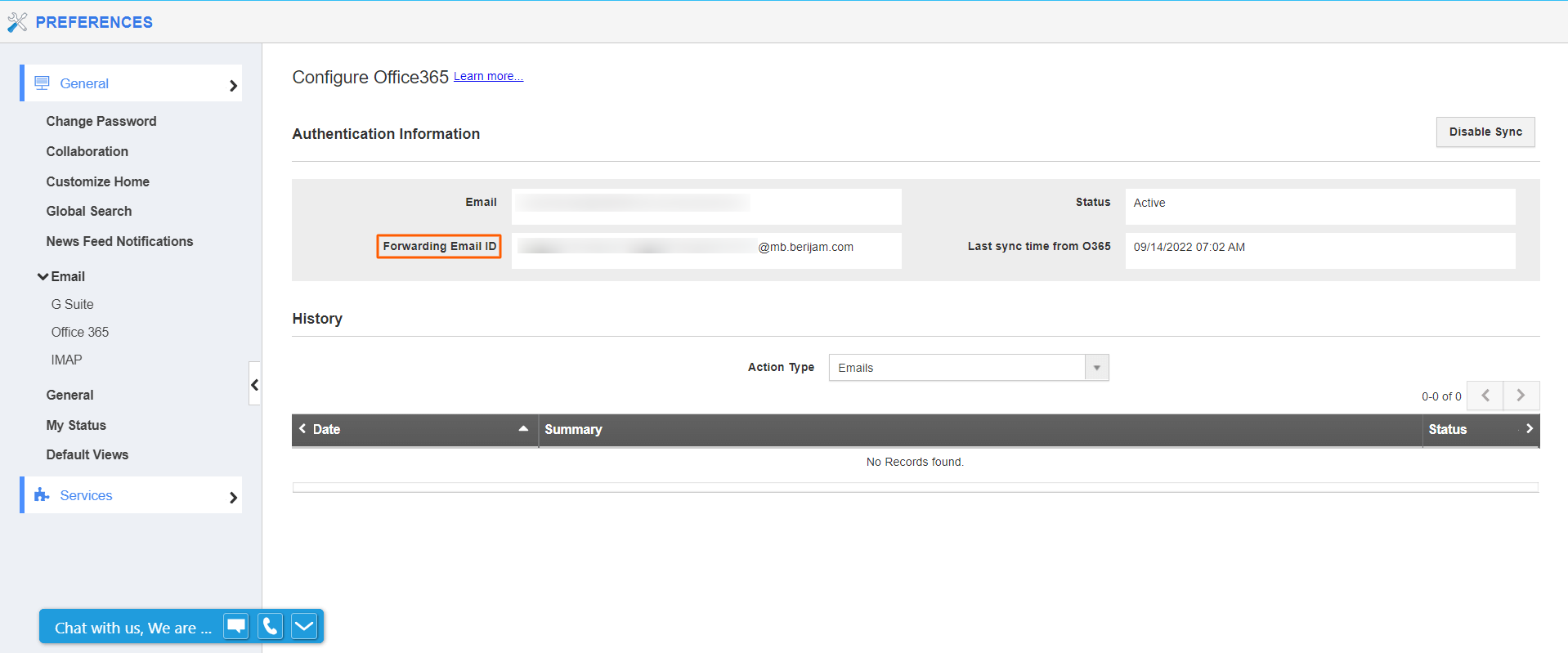 - The sync will be enabled automatically, once the authentication is successful. The forwarding Email ID field will be visible once the sync is successfully enabled.