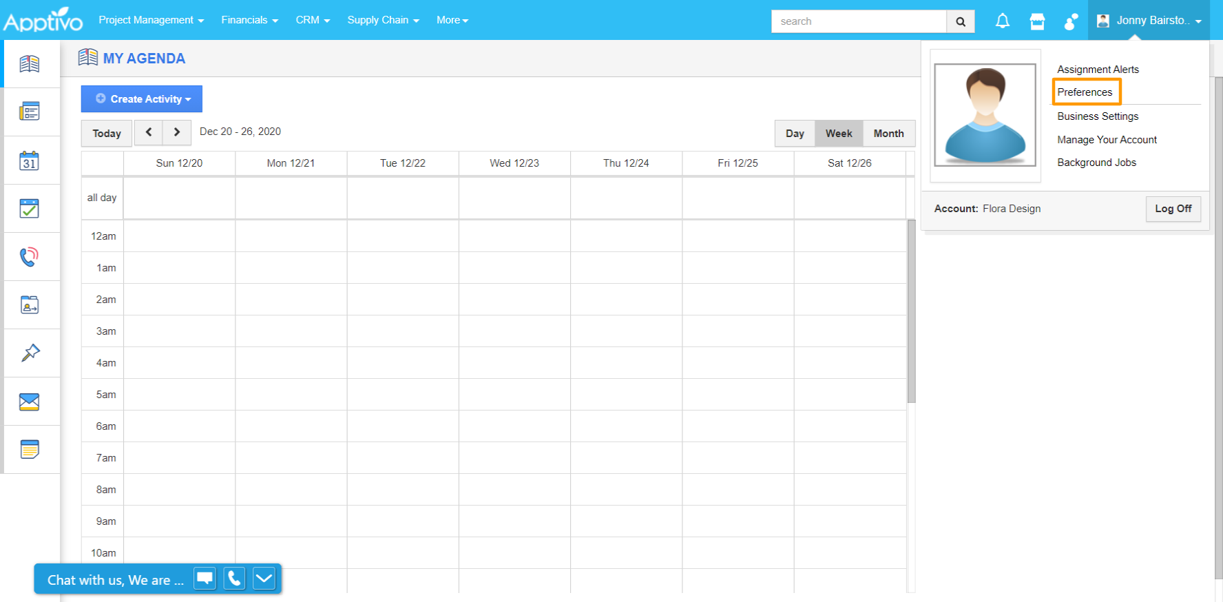 - Log into your Apptivo account using Google. Select the User Menu from the top right corner and select Preferences.