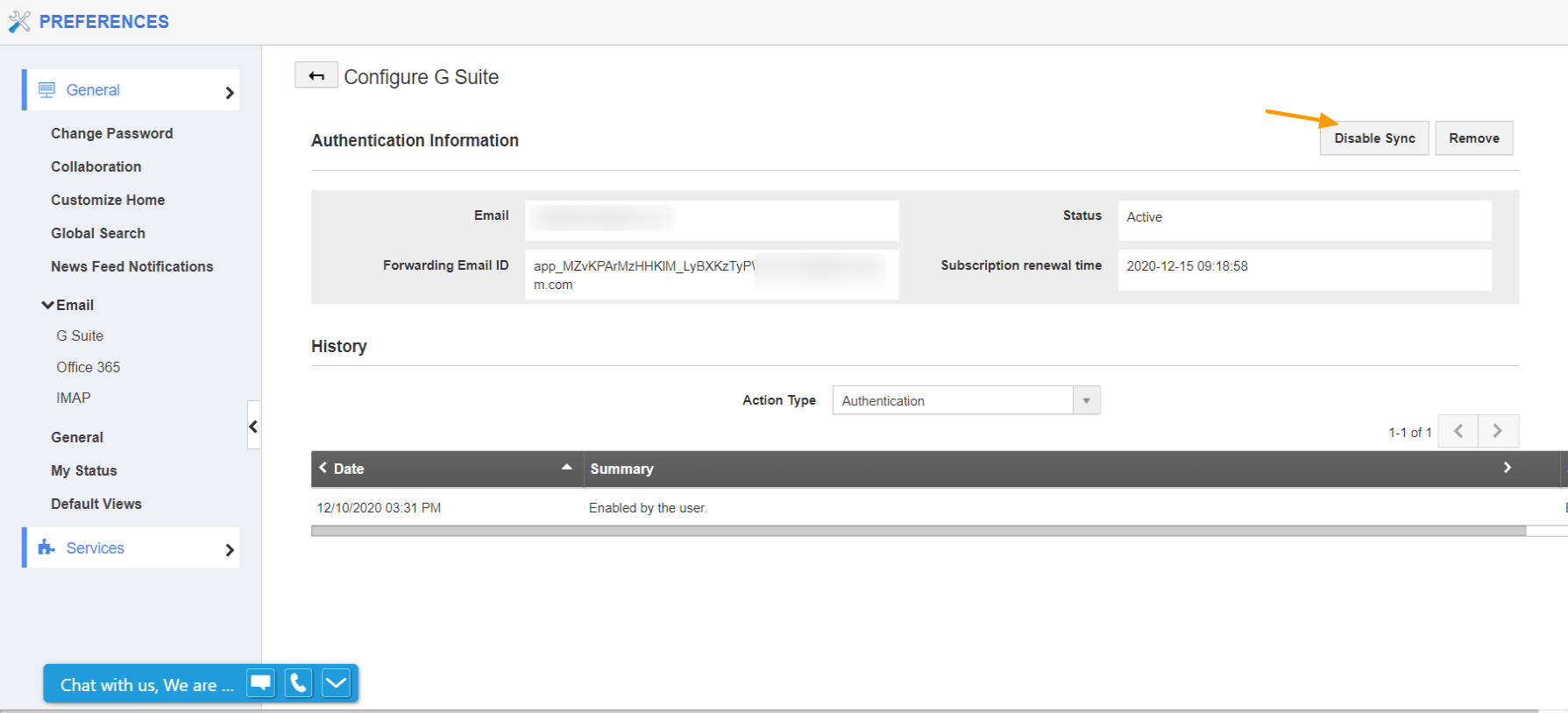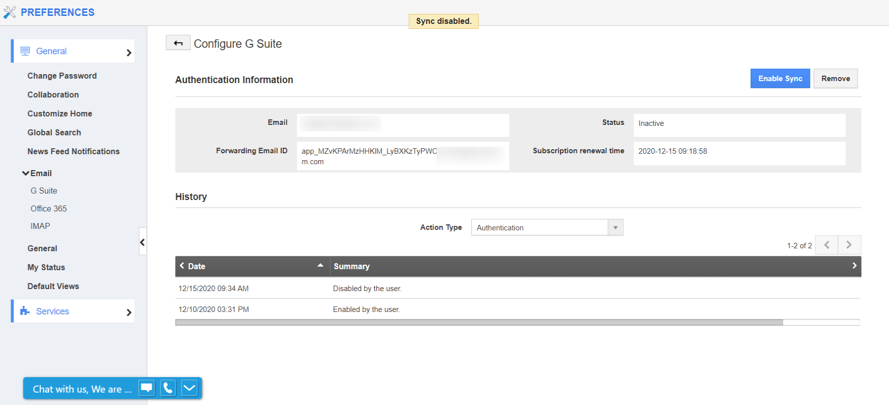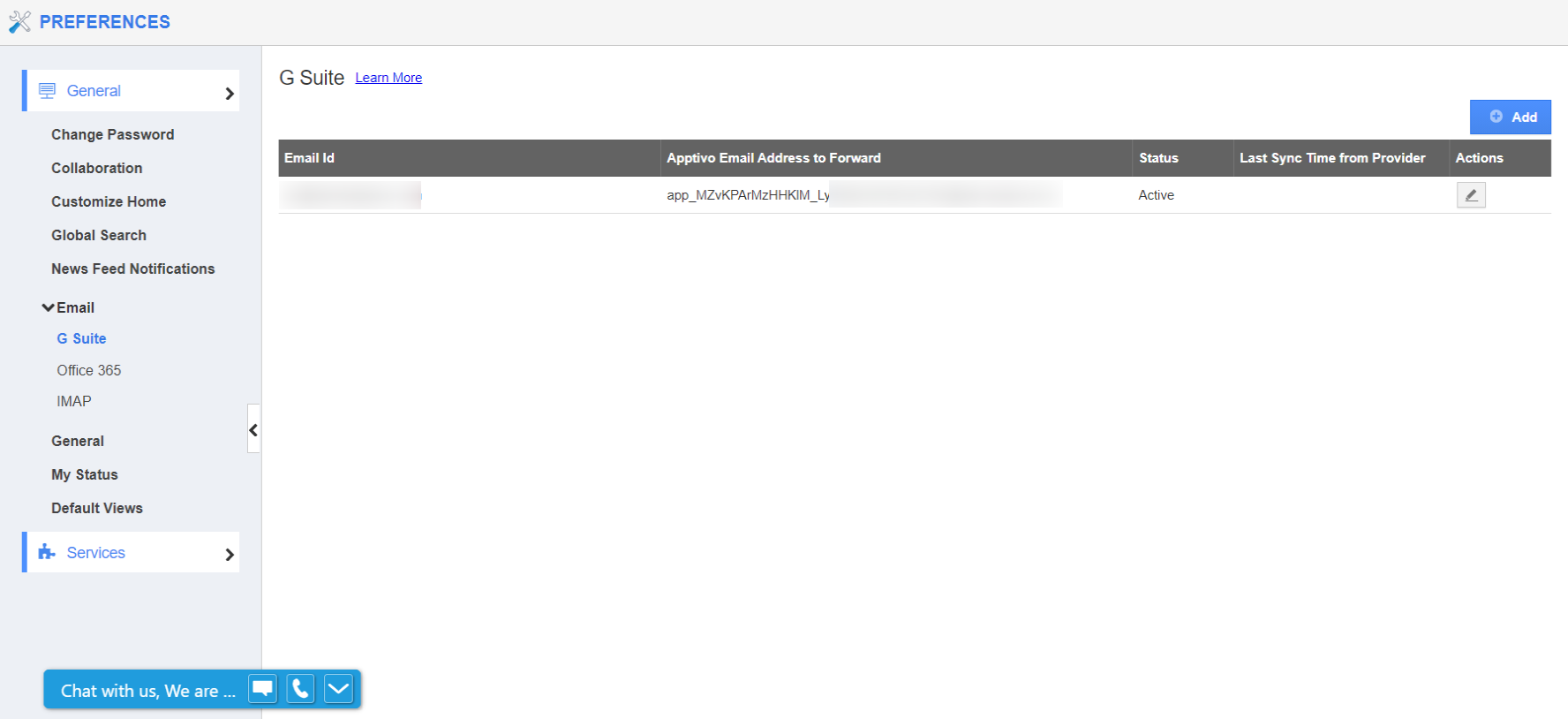 - On the Preferences page, select Email → G Suite to see the account integrated with your Apptivo account.