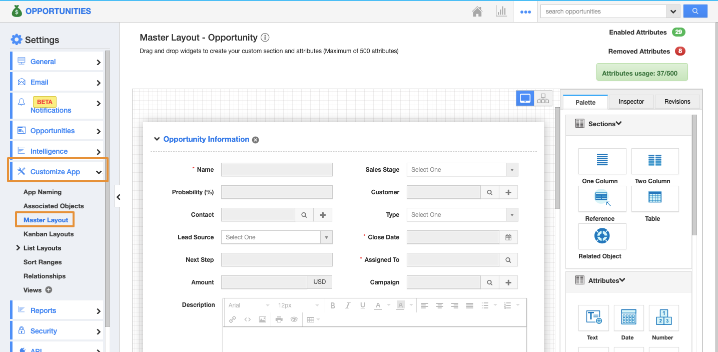 - You will be redirected to the Master layout page. Drag the Counter attribute from the "Palette → Attributes" and drop it in the place you need. For instance: Drag and drop the counter attribute to the Opportunities Information section.