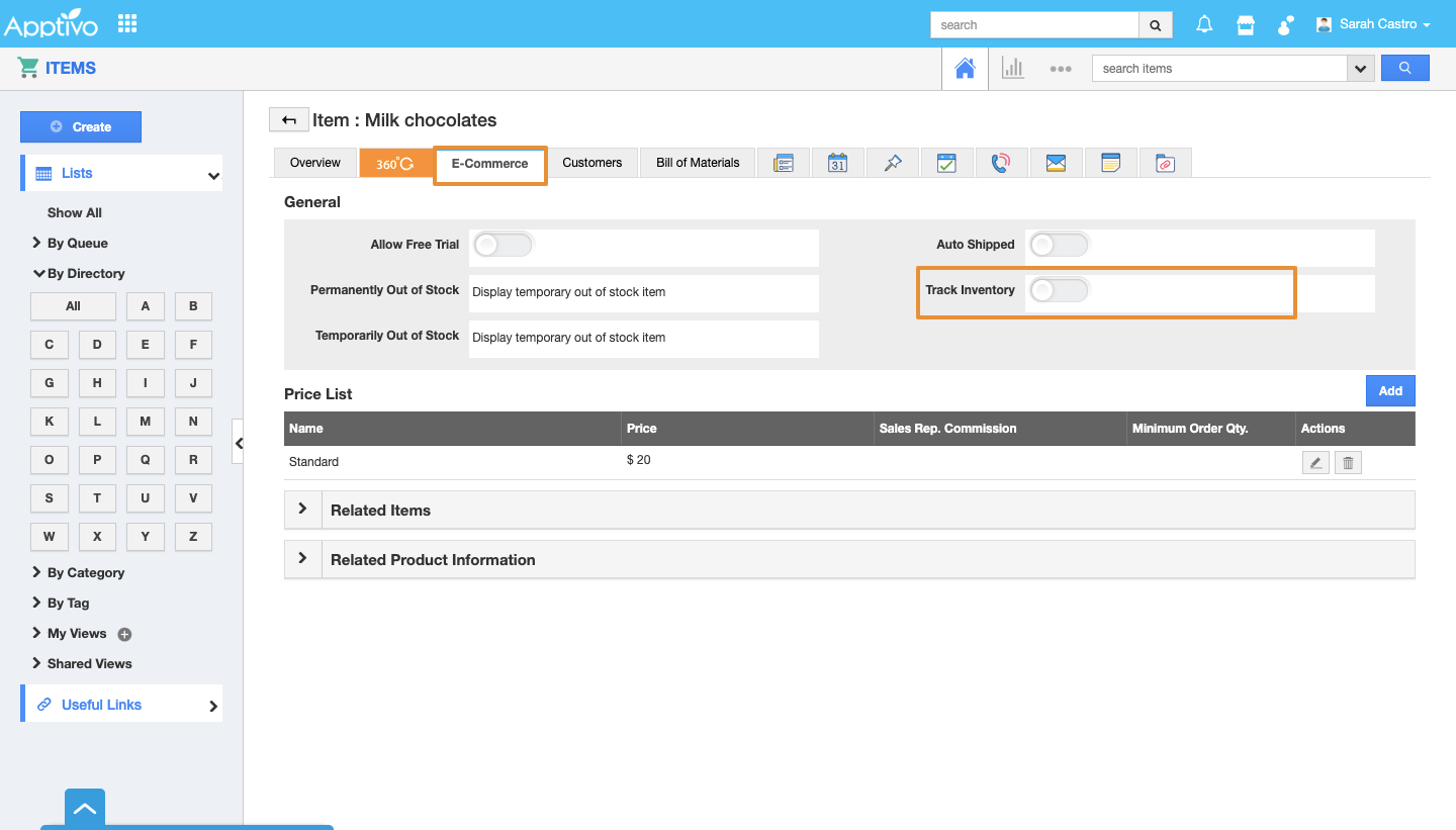 - Click on the “E-commerce” tab next to the “Overview” tab, you can view the field named “Track Inventory” which is set to “No”.