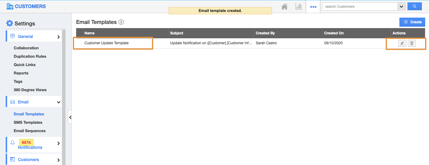 - Once created, you can update the email template by clicking on the "Edit" icon. Also, you can delete it by using the "Delete" icon, if needed.