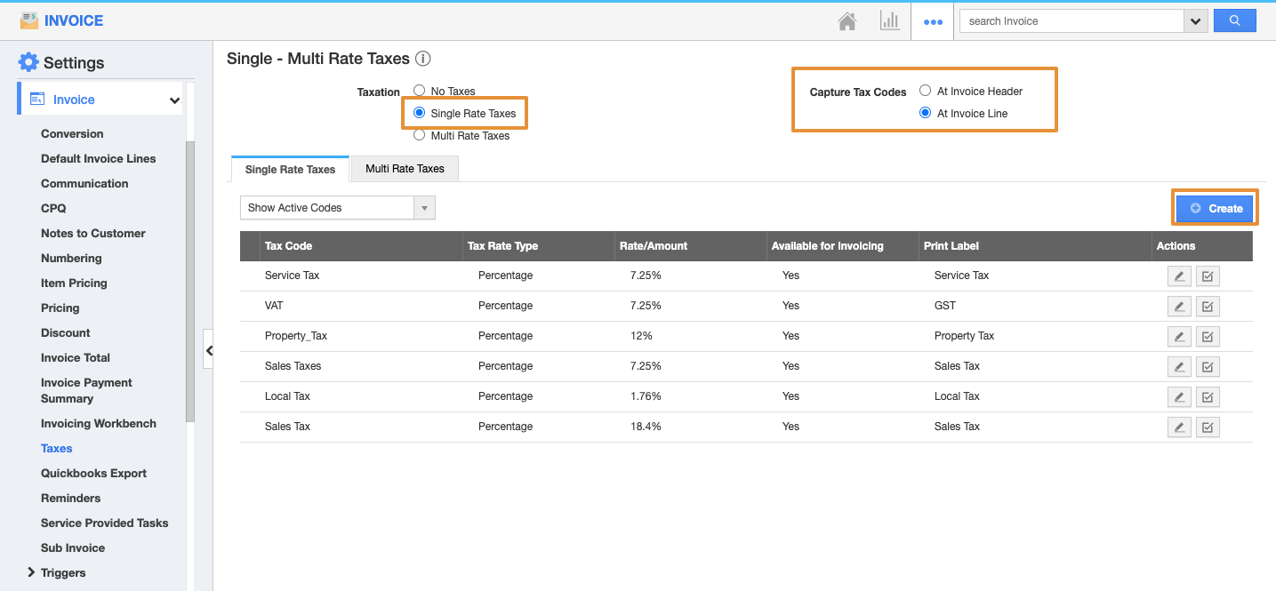 The Invoices allows you to create both Single Rate Taxes and Multi-Rate Taxes.
