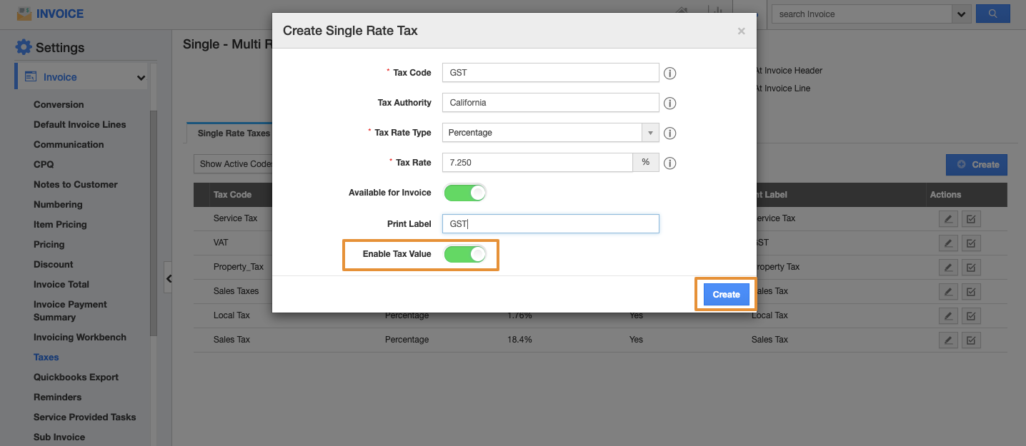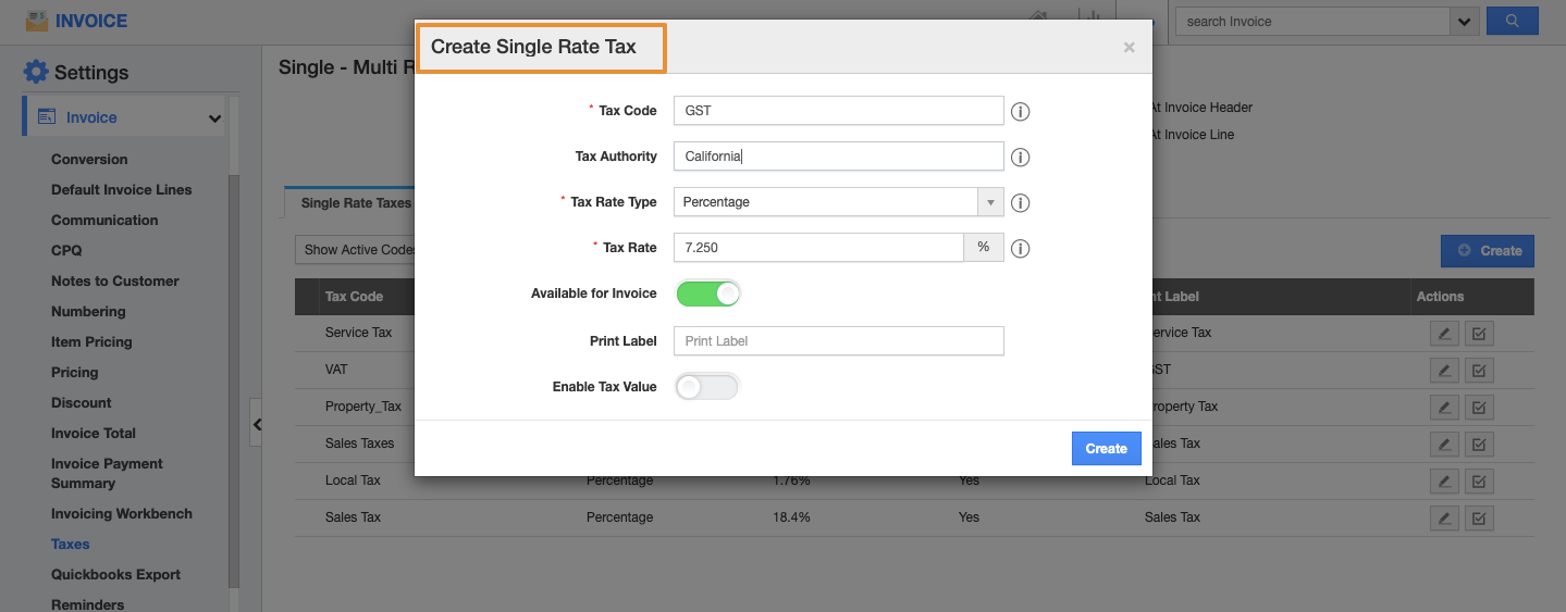 - Then, select the Single Rate Taxes tab and click on the Create button.
