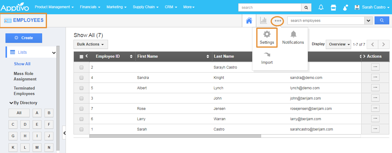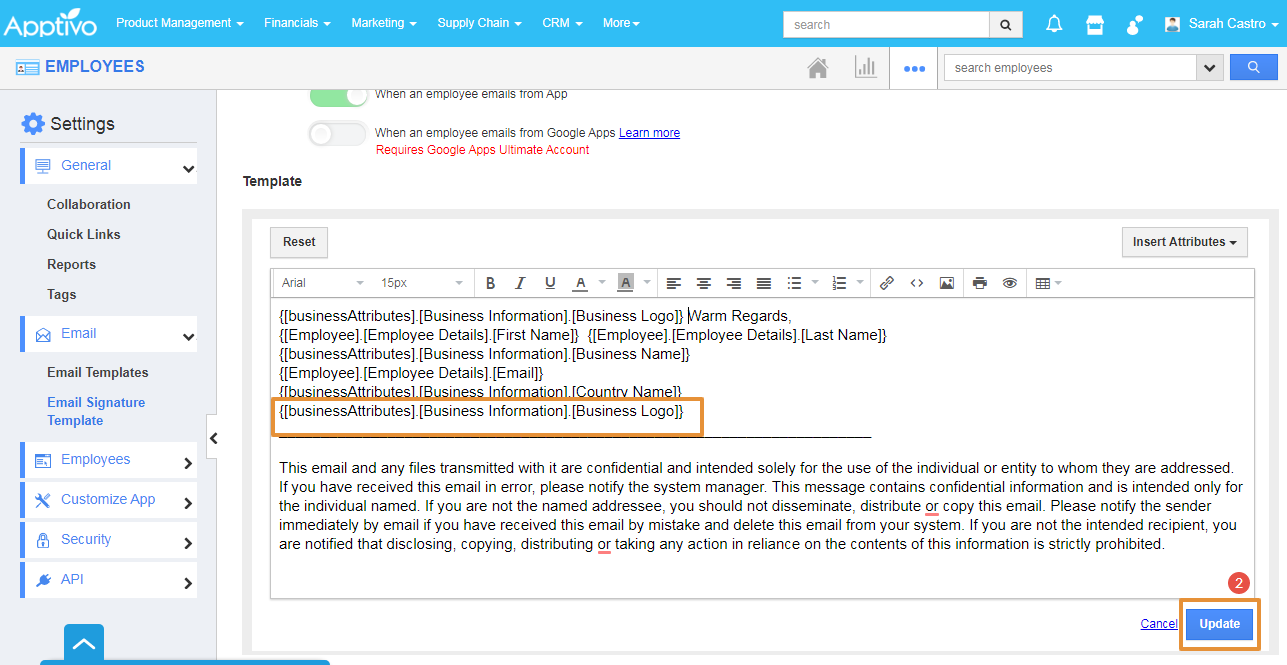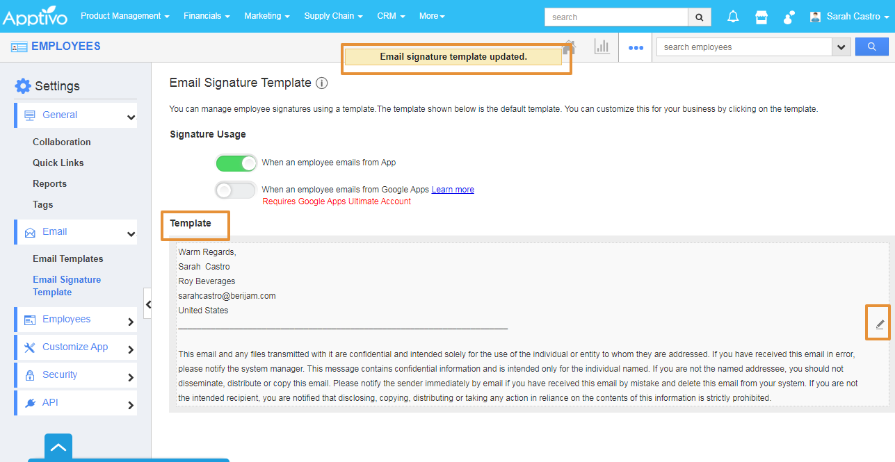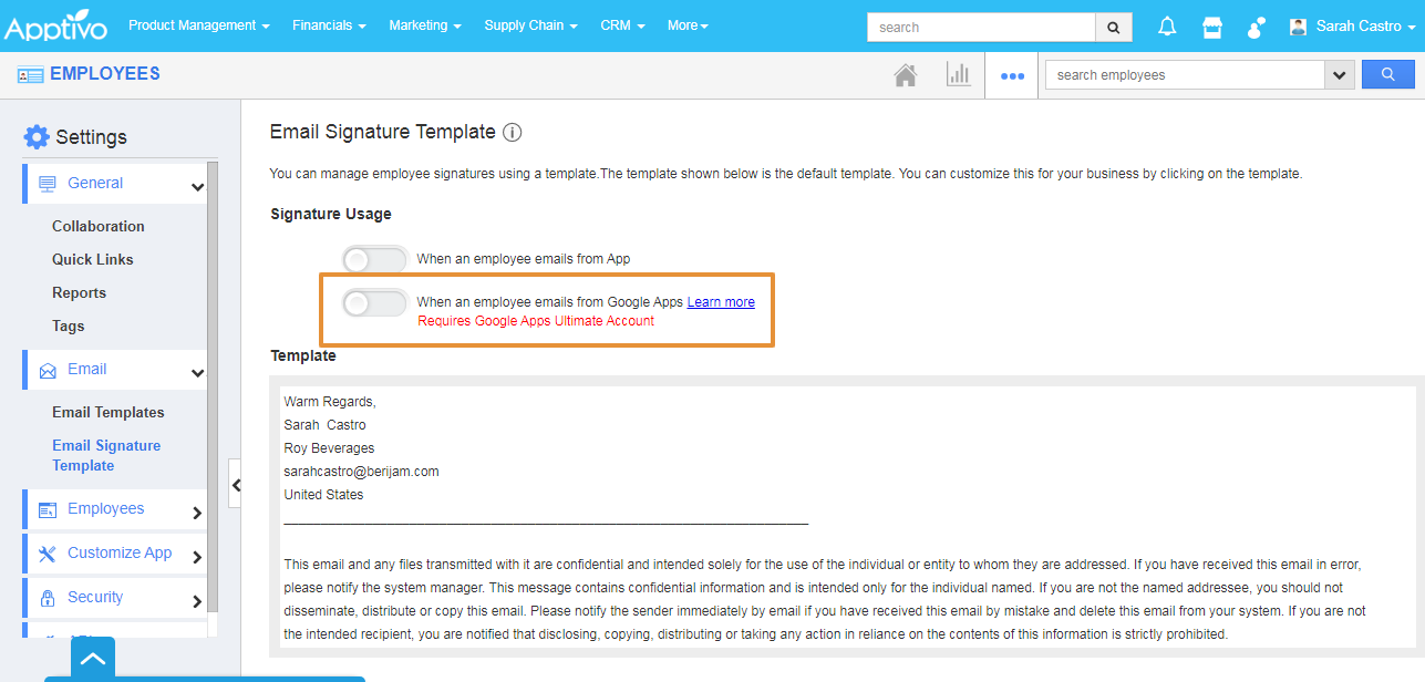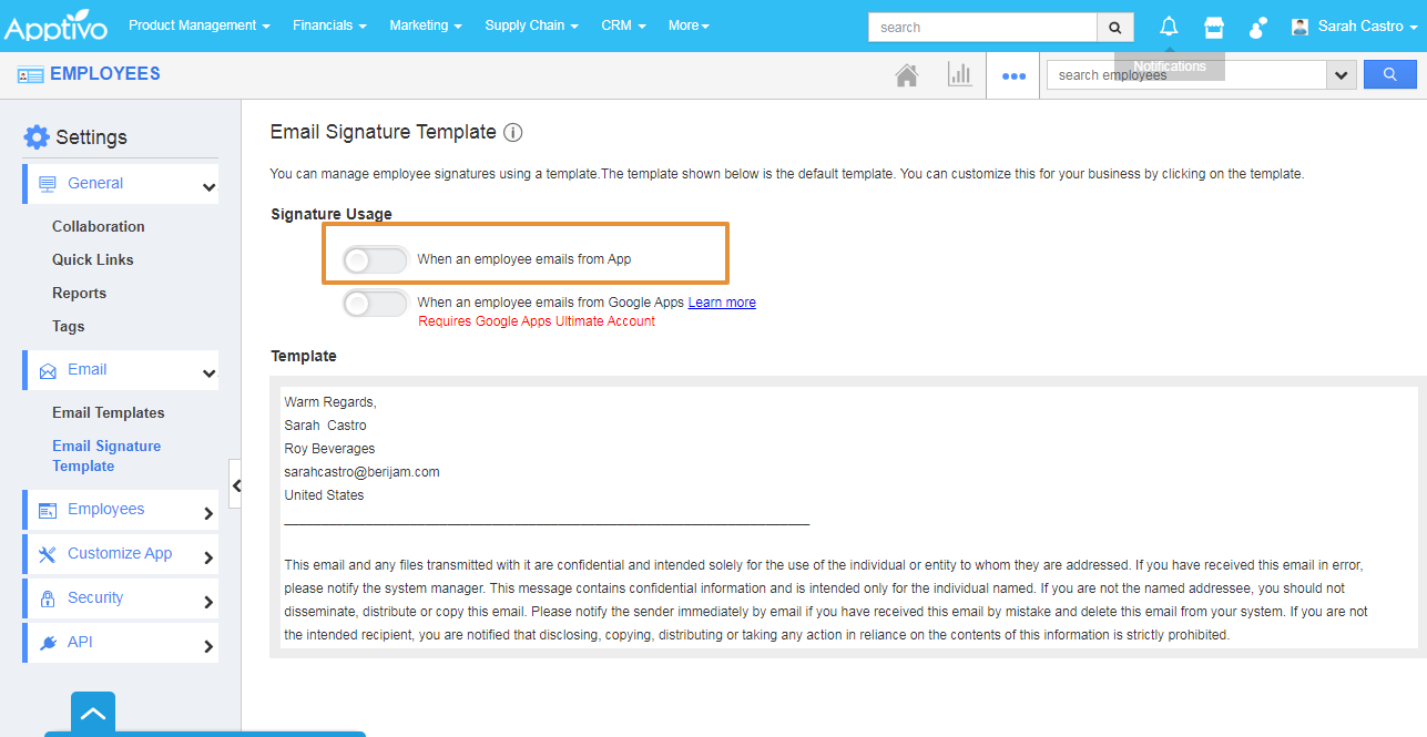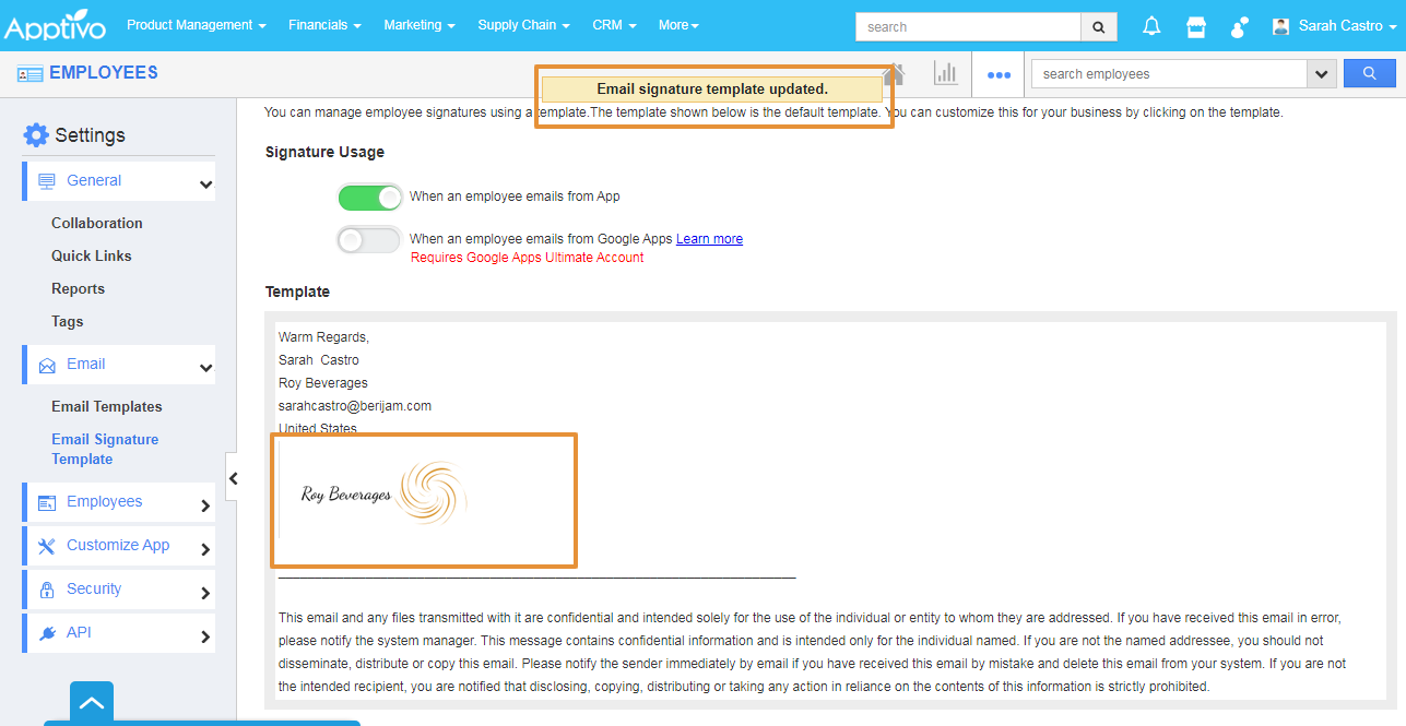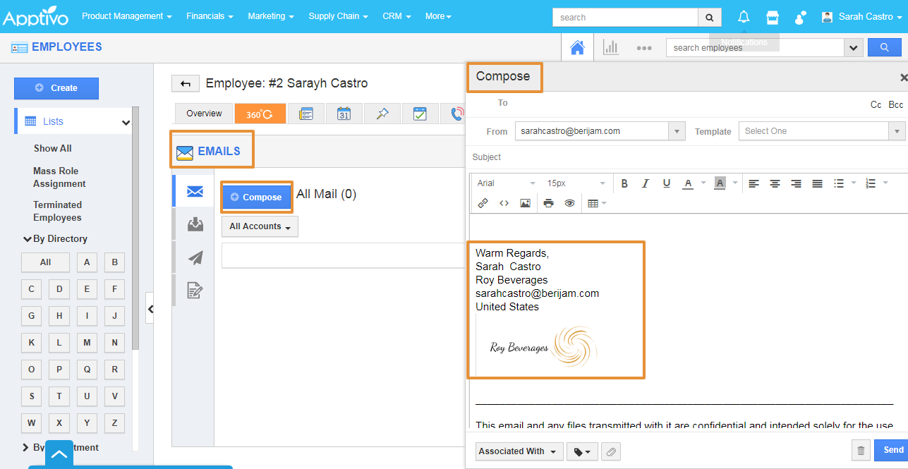 Let's consider Employee Miss. Sarah Castro joined the Roy Beverages as the Sales Manager. She wants to set her signature for her email for business communication. She can also customize the email as per her business preferences with Apptivo Employees app. Please follow the steps of how she is customizing the signature for her business purposes.