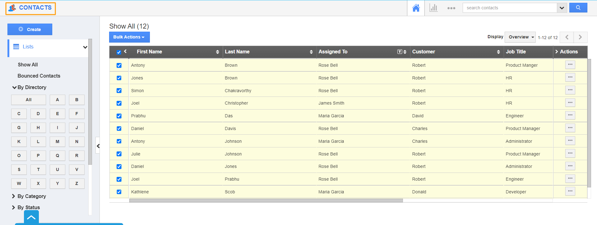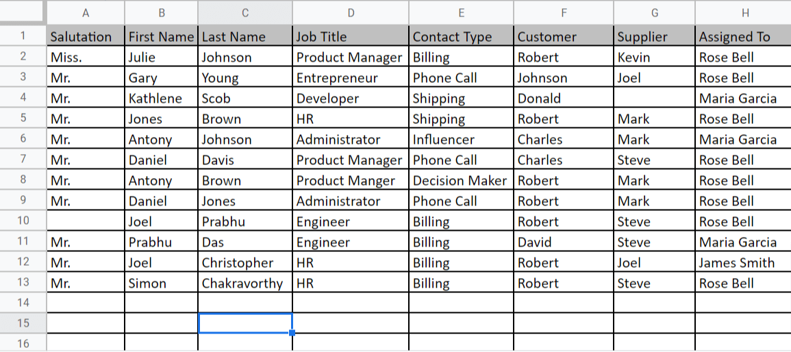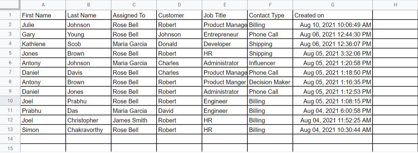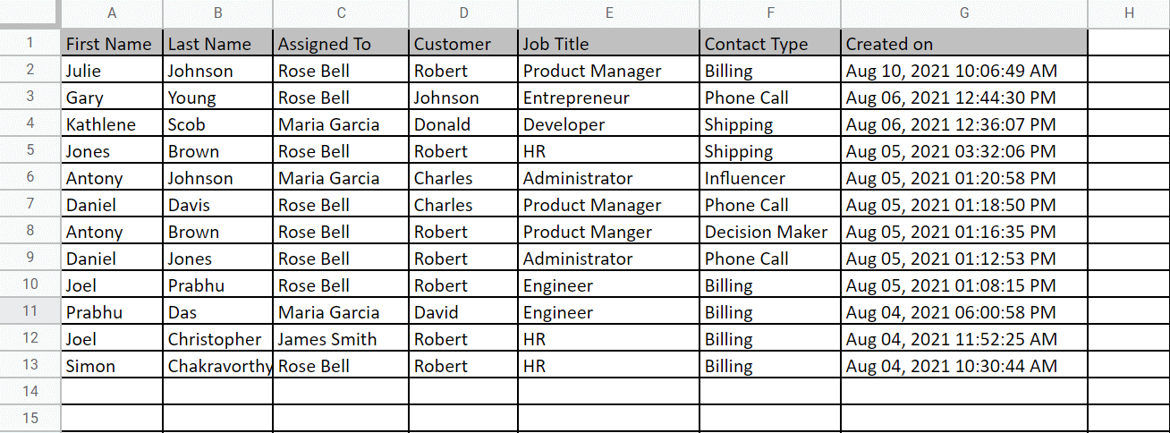 - Here, you can view all the fields present in the Contacts app in XLS format.