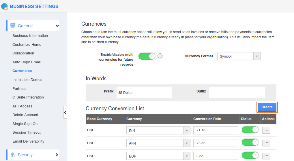 - Click on the “Create” button to add your currency conversion.