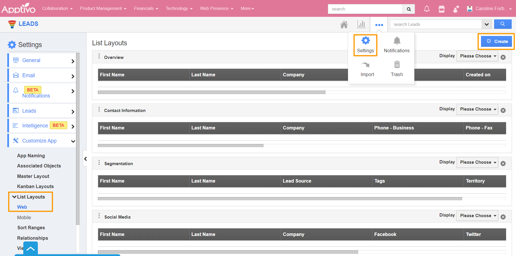 - Select the Customize App dropdown. Click on List Layouts → Web from the left navigation panel.