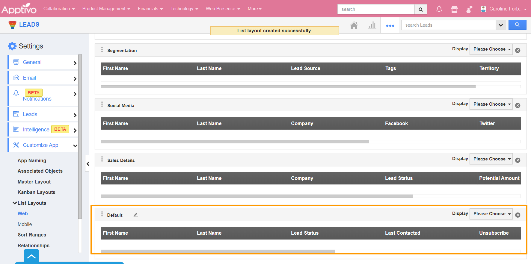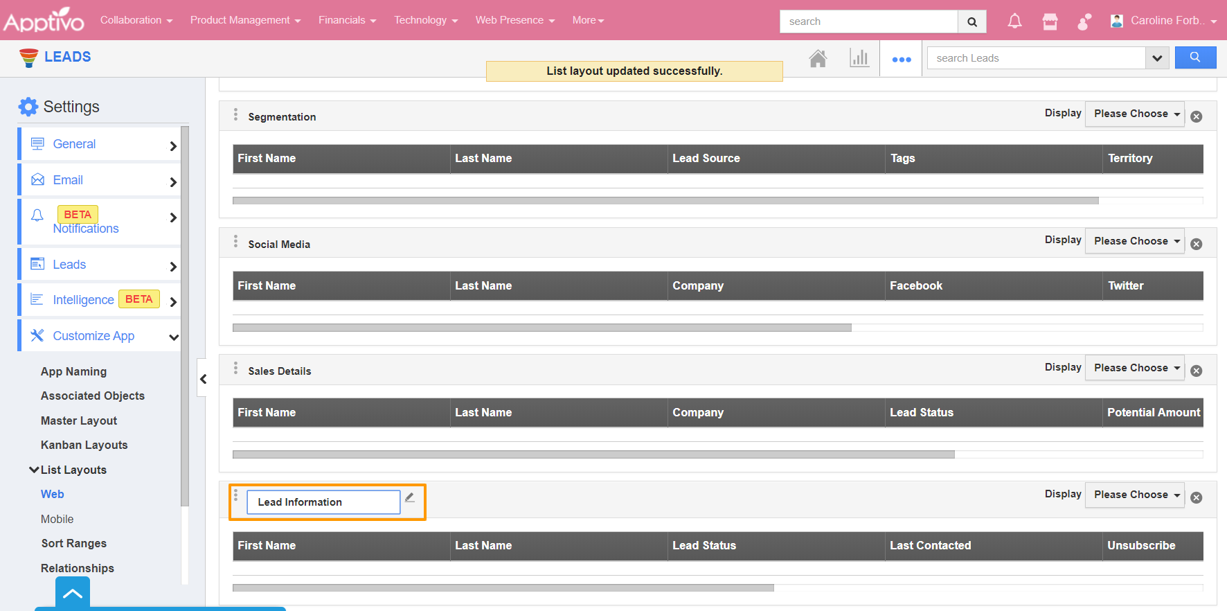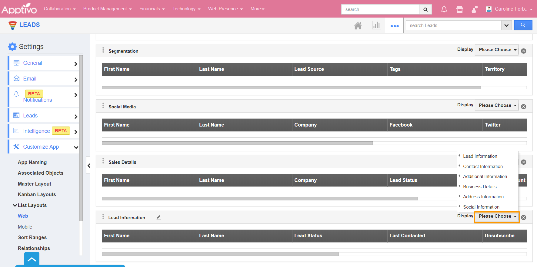 - Click on the name to rename the layout. Here, it is renamed as Lead Information. Now click on the Please Choose dropdown in Display.