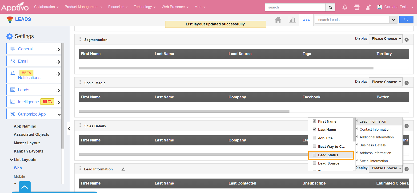 - Now, to remove the Lead Status attribute from the layout, untick it.