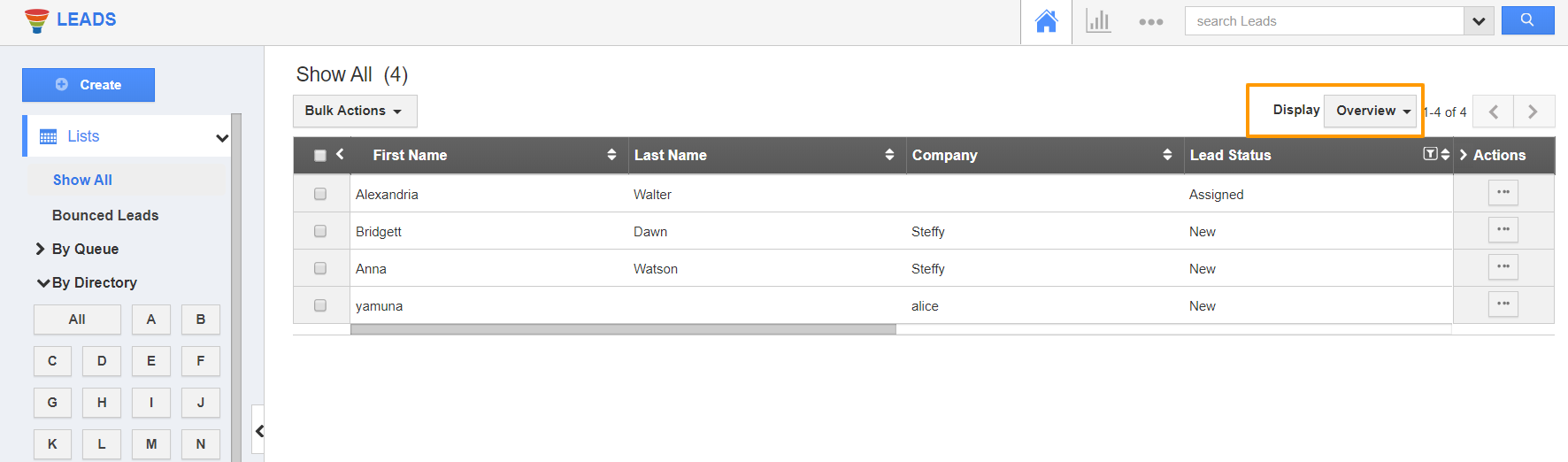 - Click on the Display dropdown, you can see Lead Information is added as a Layout. Select it. The leads will appear with the preferred column set.