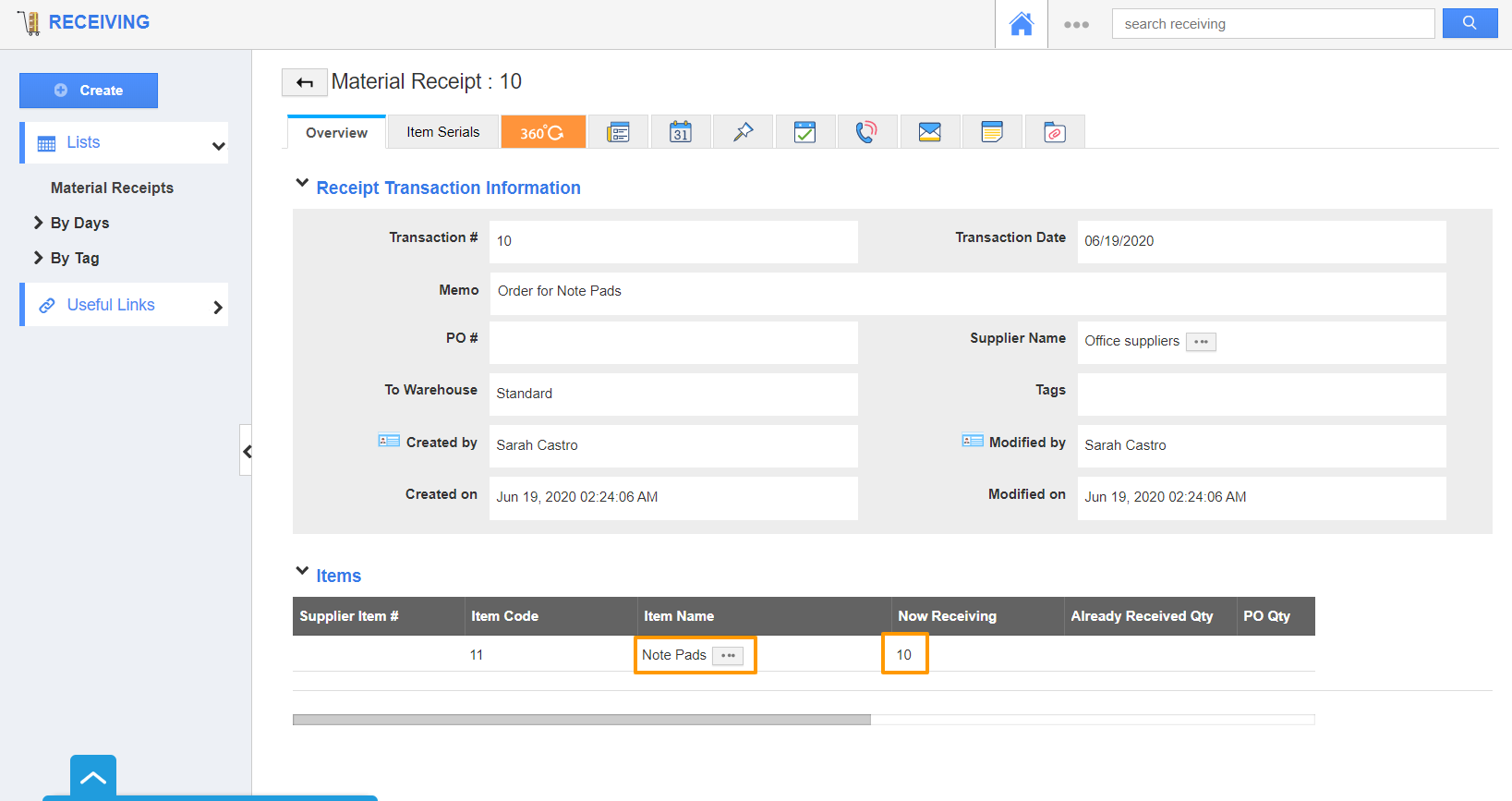 - Select the item and enter the Item quantity in the "Now Receiving" field as shown in the image below.