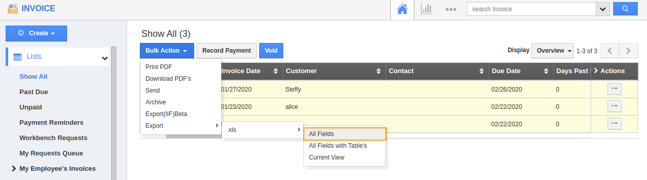 The bulk action option allows you to edit several invoices records simultaneously. You can export the invoices to an excel sheet. Let’s see how it's done. Here we go!