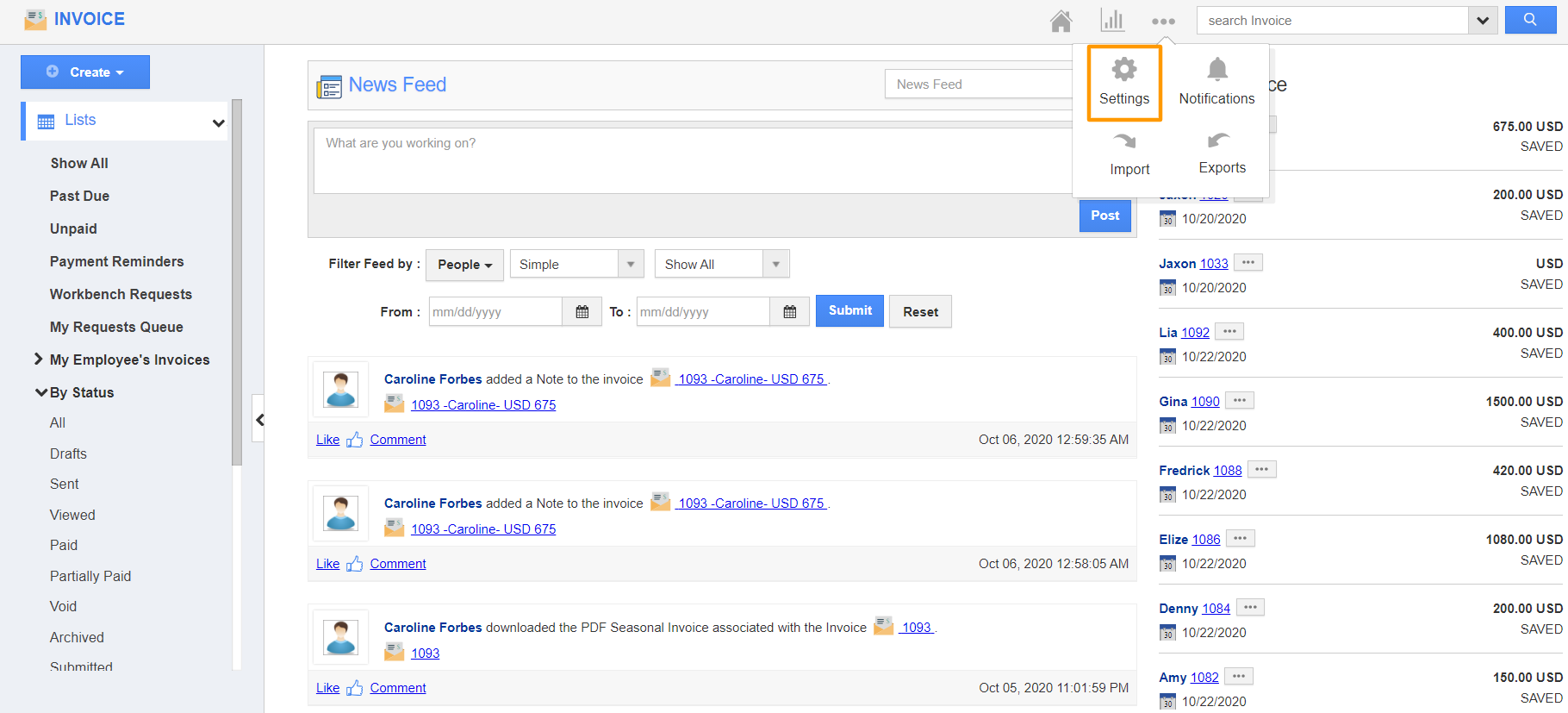 - Log into your Apptivo account and go to the Invoice app. Here, select Settings from the App Header.