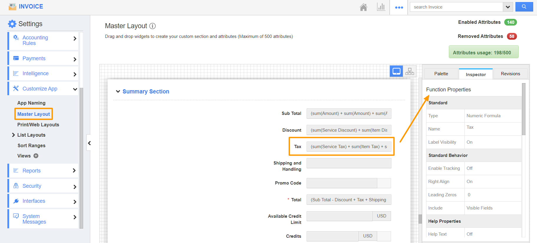 The Invoice app of Apptivo has a Master Layout that allows you to customize the fields displayed in your invoice app layout. The Function attribute field empowers businesses to perform calculations by collecting values from other fields.