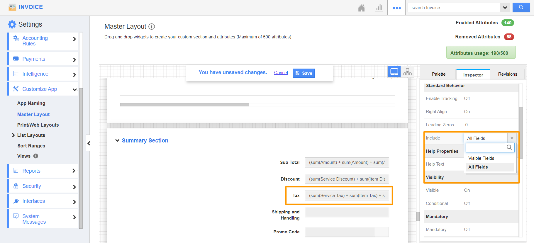 - To include the hidden field (Item Tax), go to the Inspector tab of the Tax field. Scroll down to the Standard Behavior section and select All Fields in the Include dropdown. By this, if a field added in the formula is hidden, it will also be included while performing calculations.