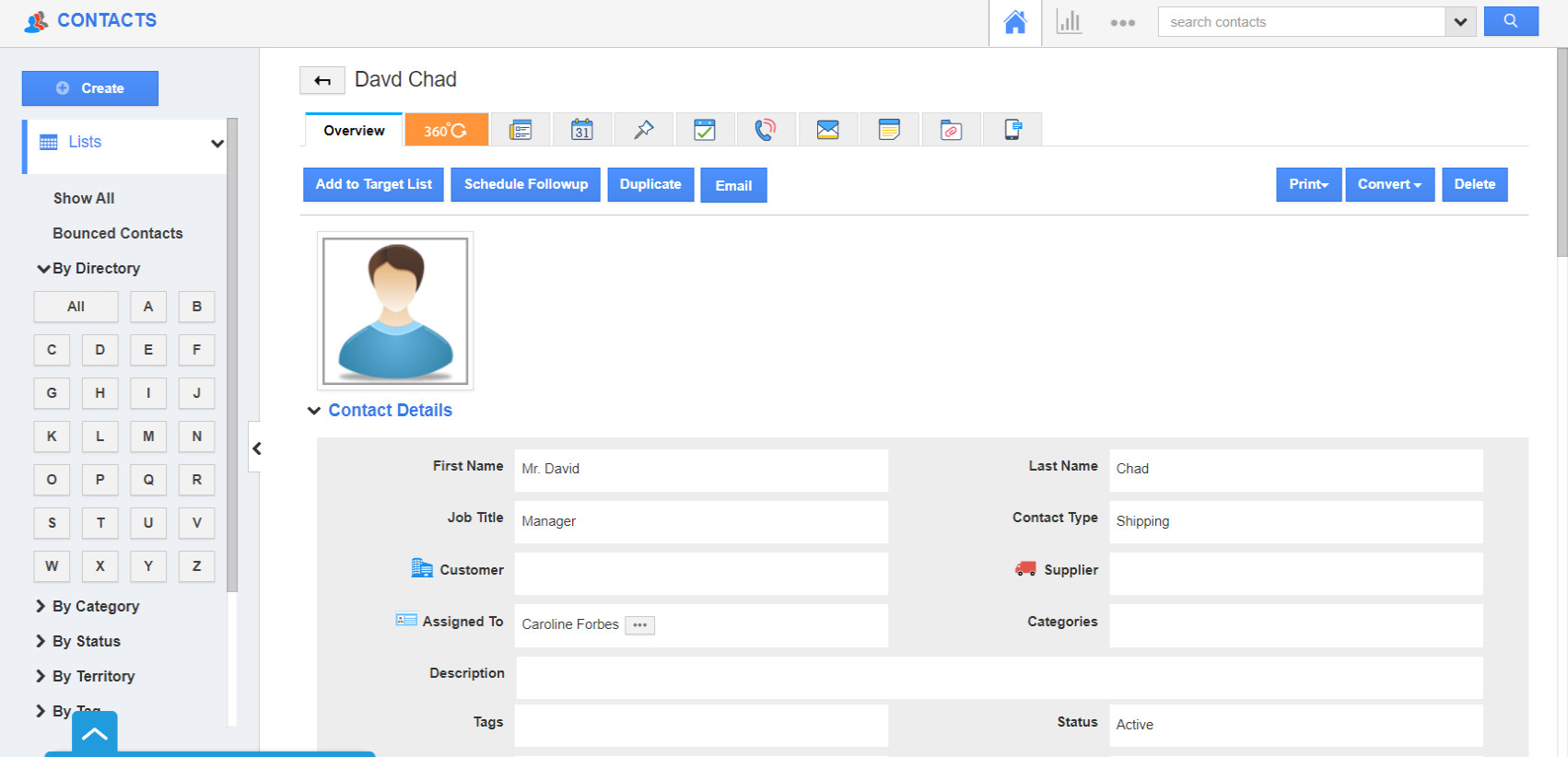 - Here, navigate to the overview page of any contact in the Contacts App of Apptivo CRM Software.