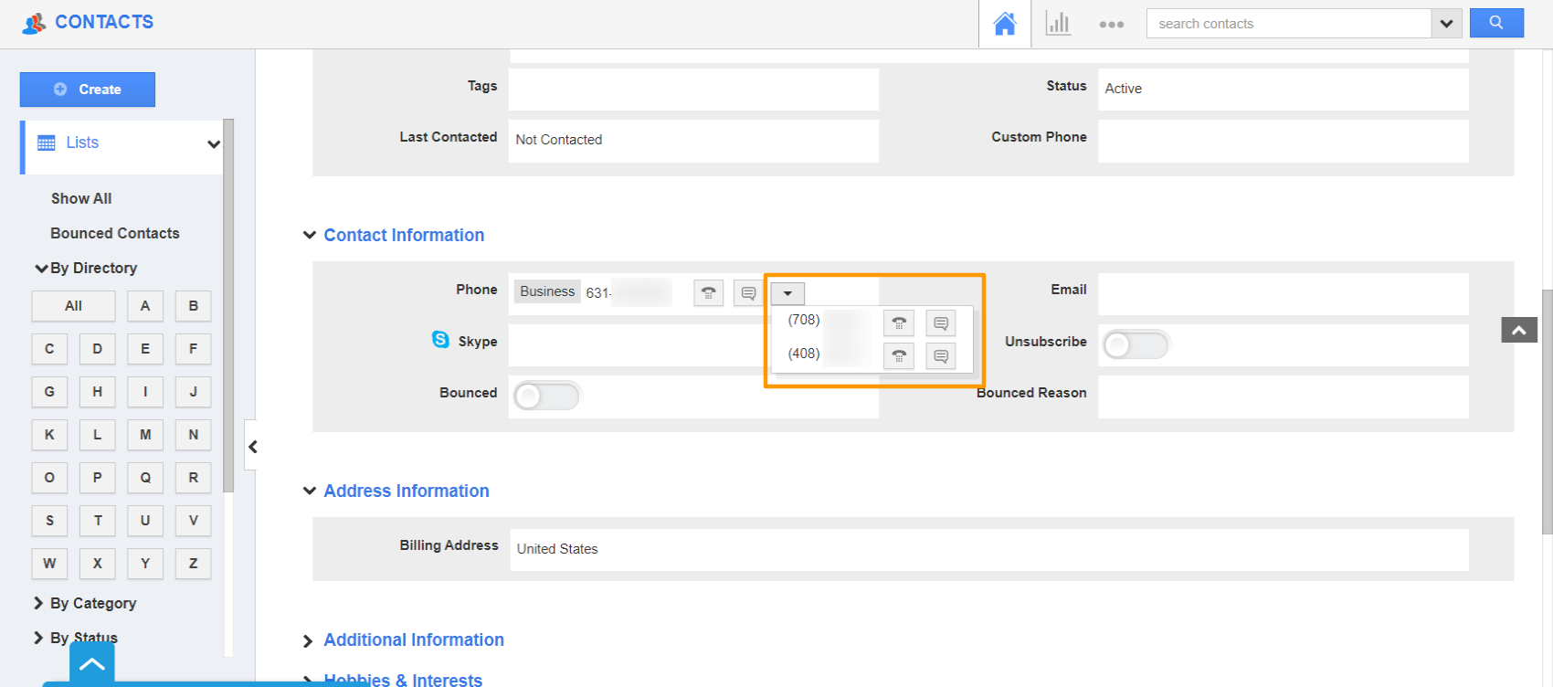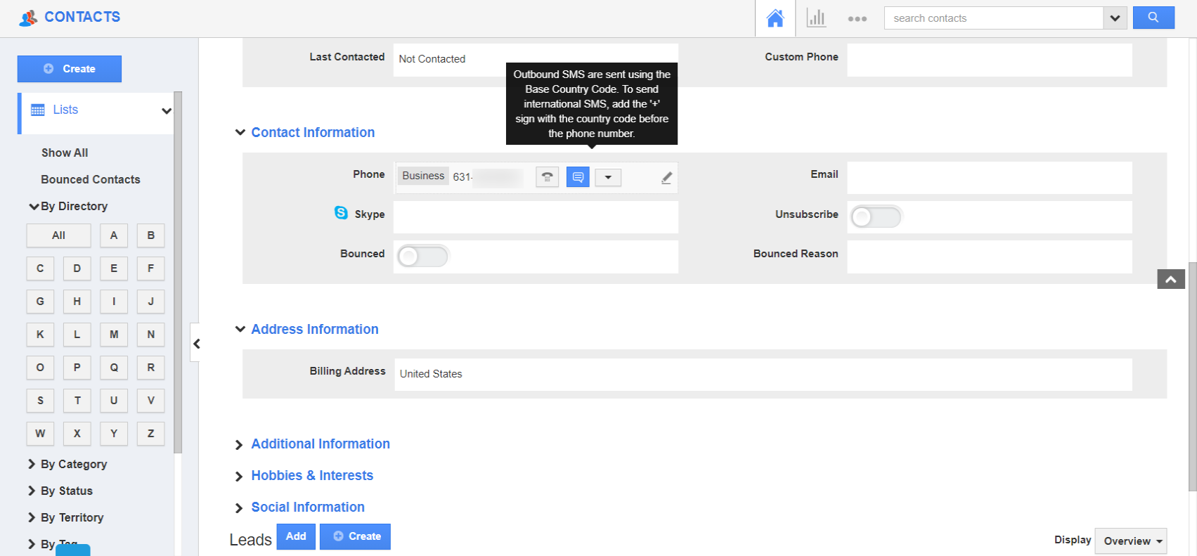 - Scroll down to the phone number field. The “Click to SMS” feature is available in both standard and custom phone number fields. Select the Message icon.