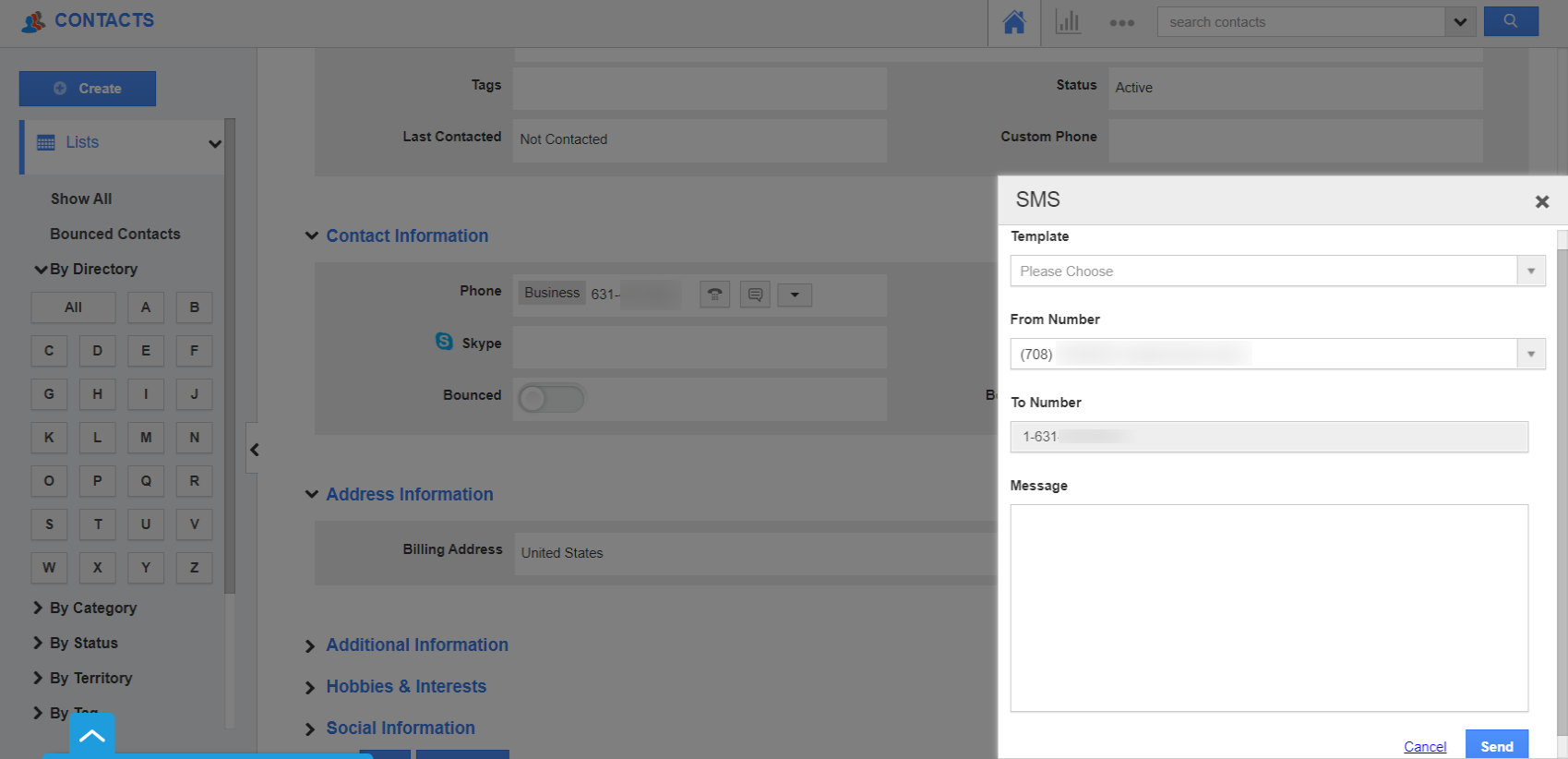- The SMS Side Panel comes into view. Here, you can choose a template, From Number, and add the message.