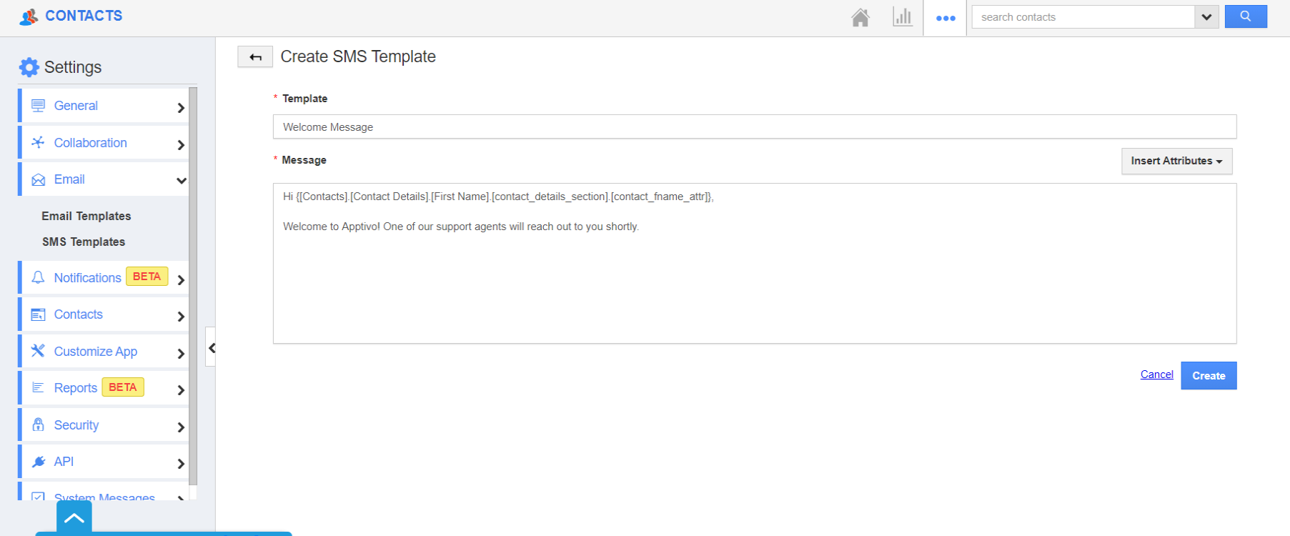 - If the Insert Attributes option is used while creating the SMS template, the data will be pulled automatically from the configured field.