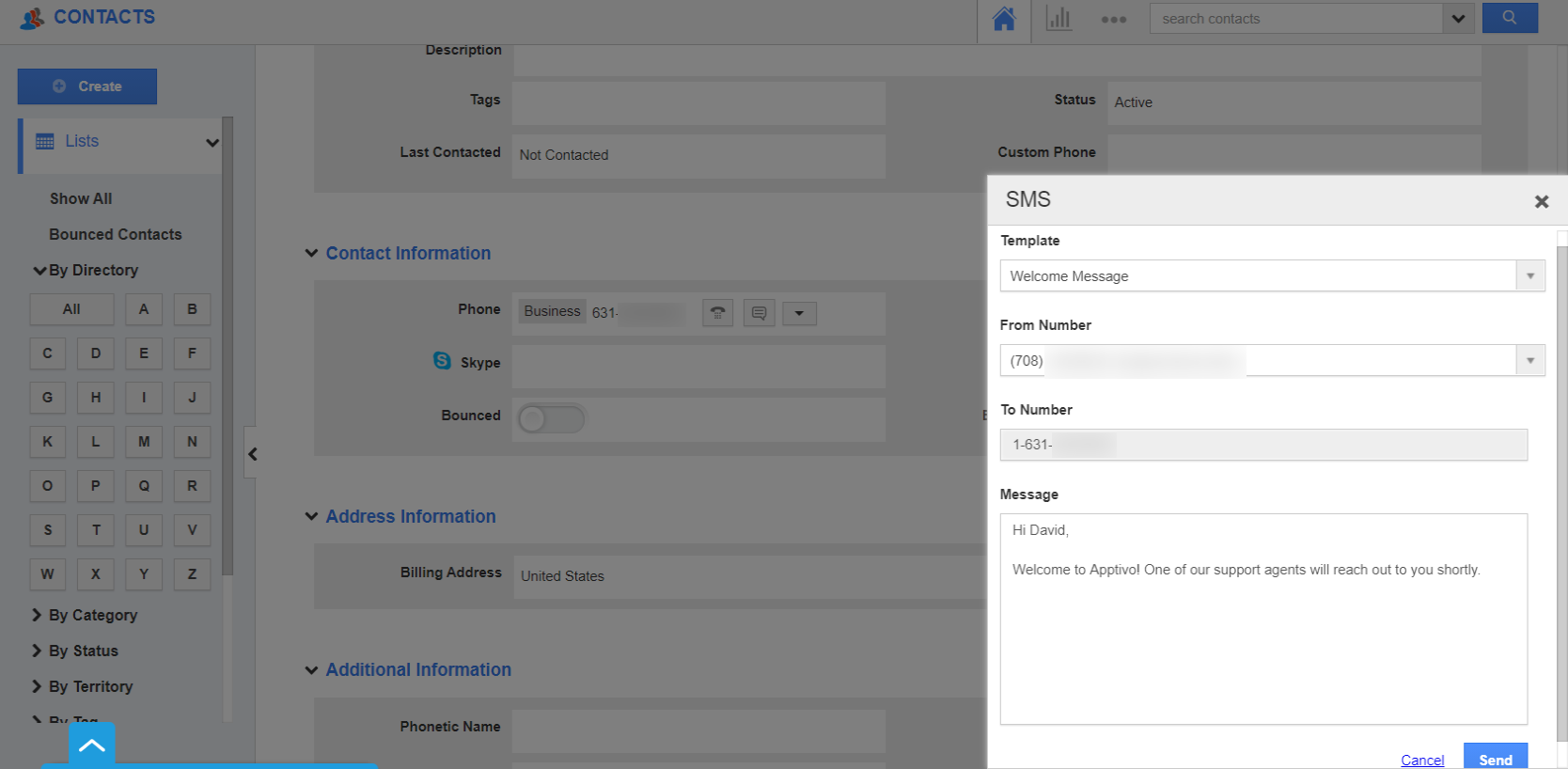 The Contact Center App of Apptivo allows you to send text messages instantly using the Click to SMS feature. This feature is available across the Contacts App, Leads App, and Customers App of Apptivo.