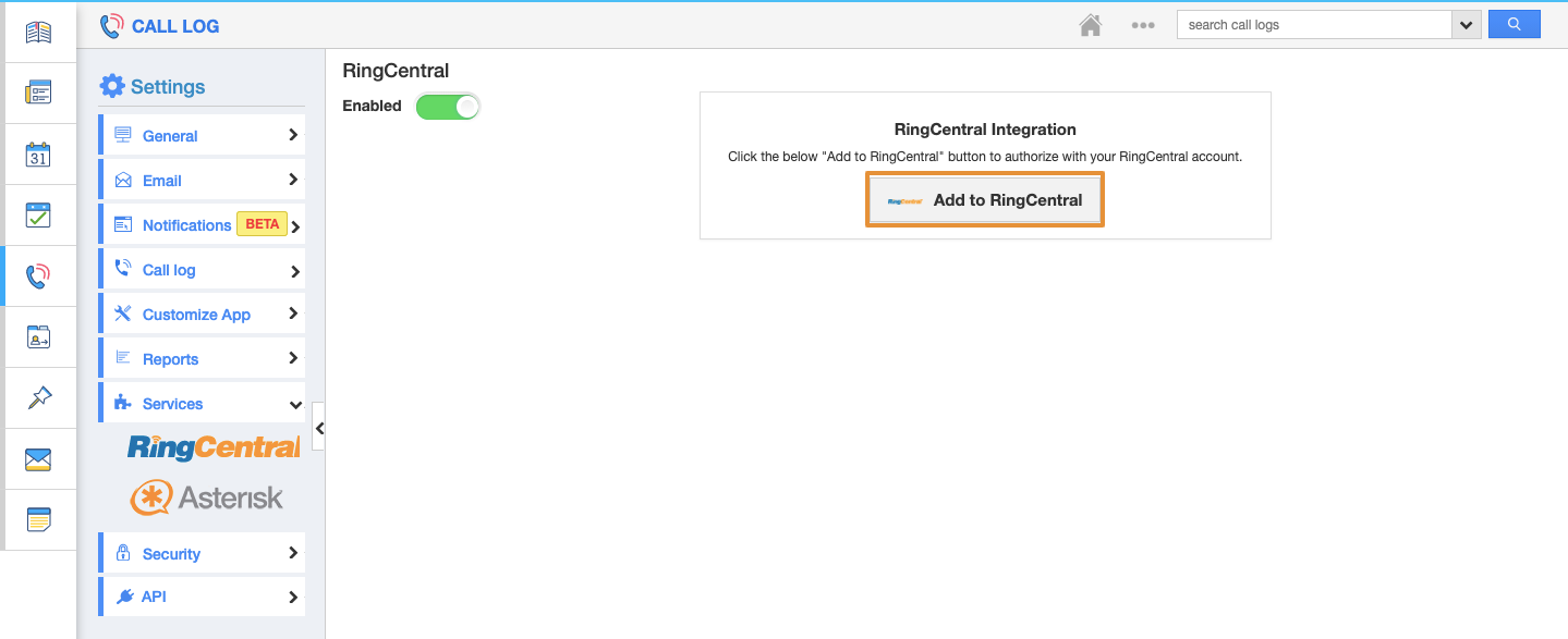 - Disable the Ringcentral toggle in Call Logs → Services” → “RingCentral.
