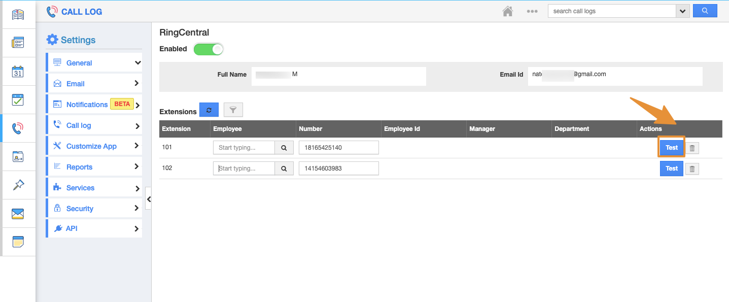 - After authentication, you can make a call in call log setting. Click on "Test" button.
