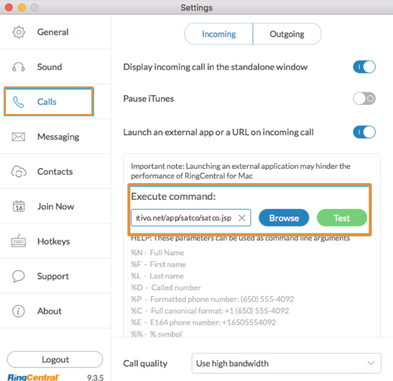 https://www.apptivo.com/app/ringcentral.jsp?phoneNumber=%E&firstName=%F&lastName=%L - Click on the “Test” button to test whether the execute command is functioning perfectly.