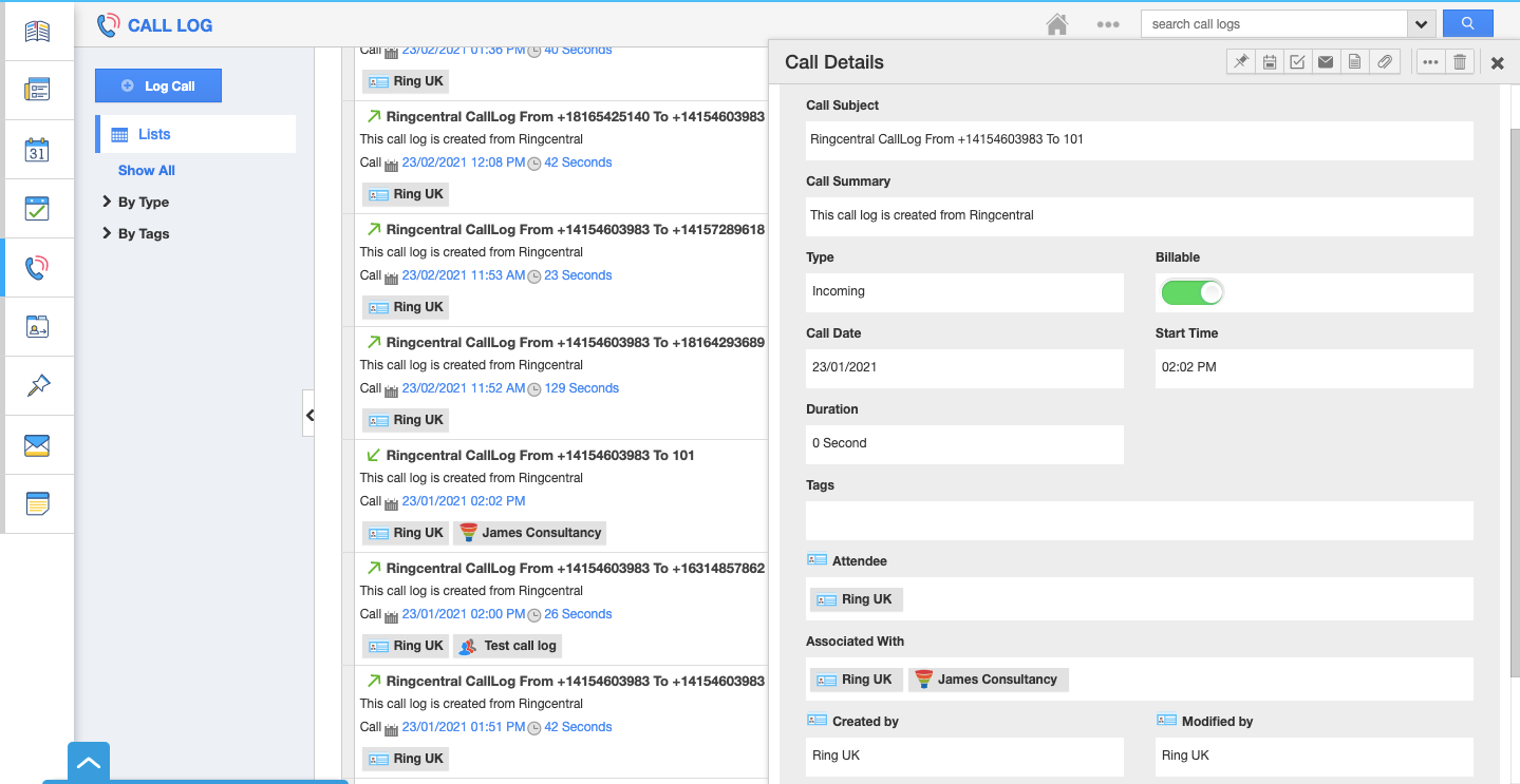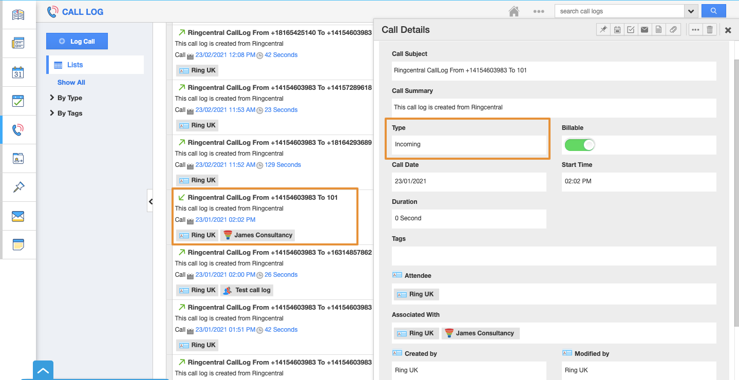 - Enables Call Tracking - All the RingCentral calls can be tracked. Whether its incoming or outgoing, it will be automatically logged irrespective of whether they originate from Apptivo web or mobile apps.