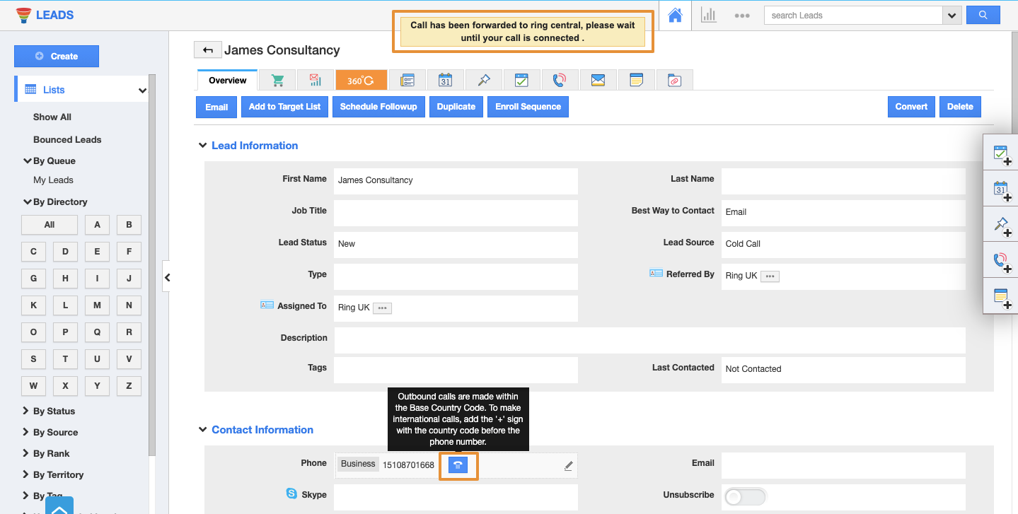 You are ready to use RingCentral, once the RingCentral in Apptivo CRM is enabled and you have logged into the RingCentral account. Now you can do the following tasks: