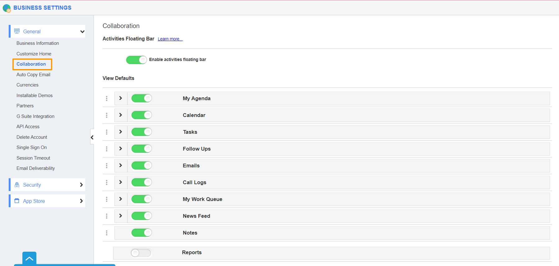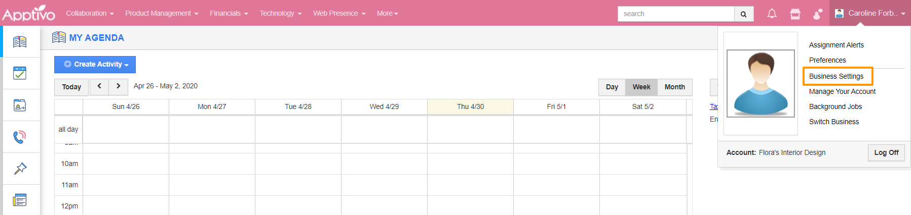 - Log in to your Apptivo account. Click on Business Settings from the User Menu in the top right corner.