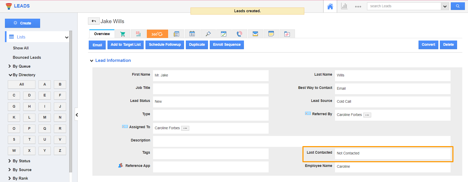 - Now, go to any of the CRM Apps. Consider creating a new lead from the Leads App. Initially, the Last Contacted field will be displayed as "Not Contacted" as shown: