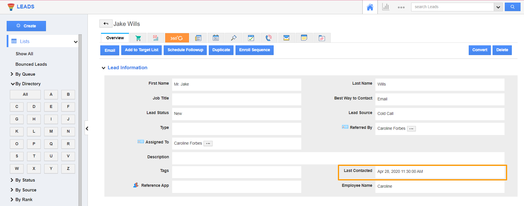 - Now, the Last Contacted Date will be set to the call log's date as shown: