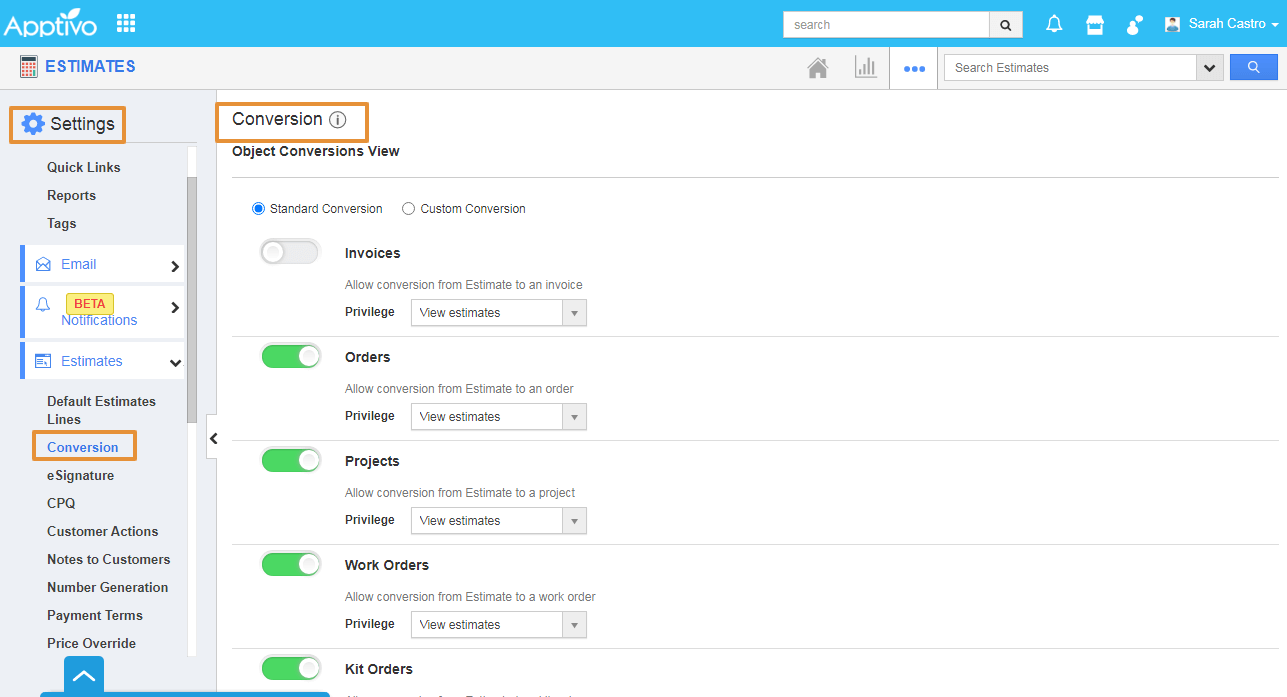 - In the Settings page, click on the Estimates and select the Conversion.