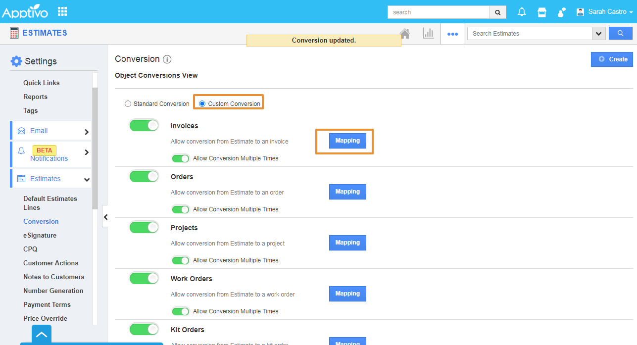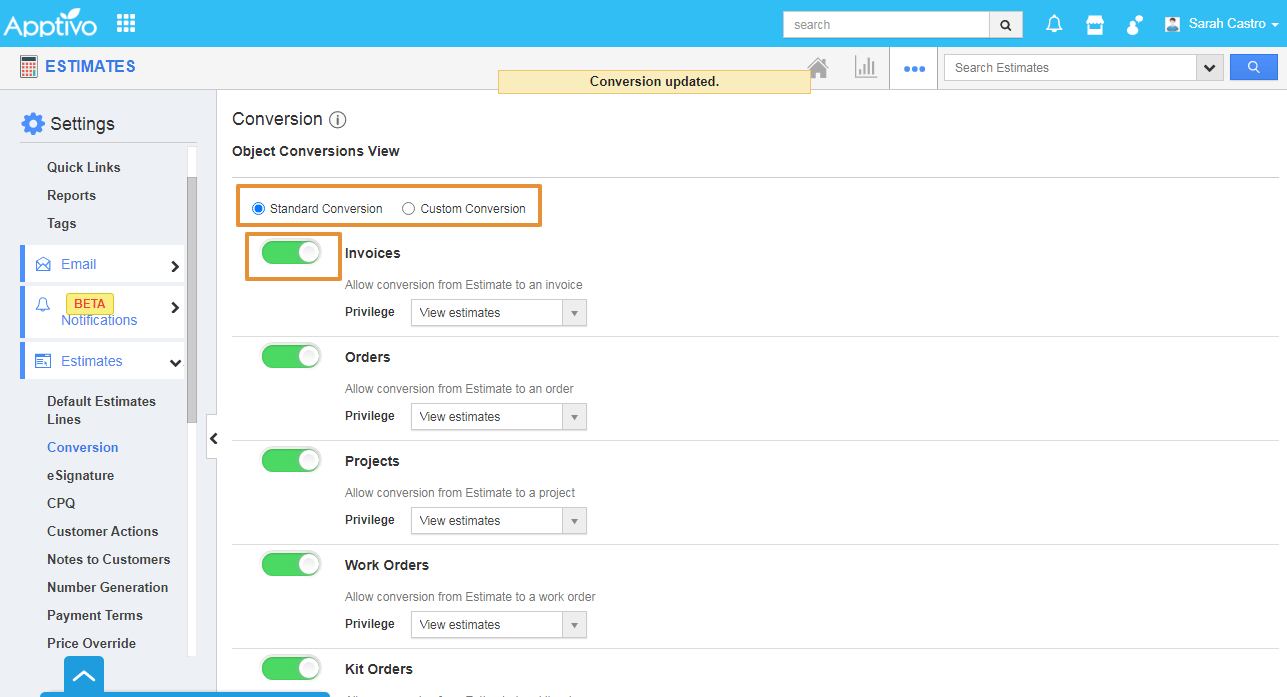 - Enable the Toggle to Allow conversion from Estimates to Invoices.