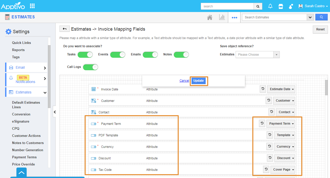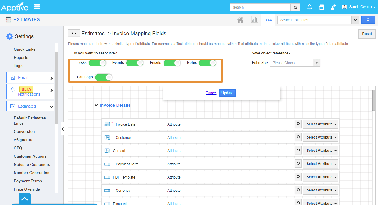 - You can map the Invoices attribute with the Estimates Attributes by selecting the attributes in the Select Attribute dropdown.