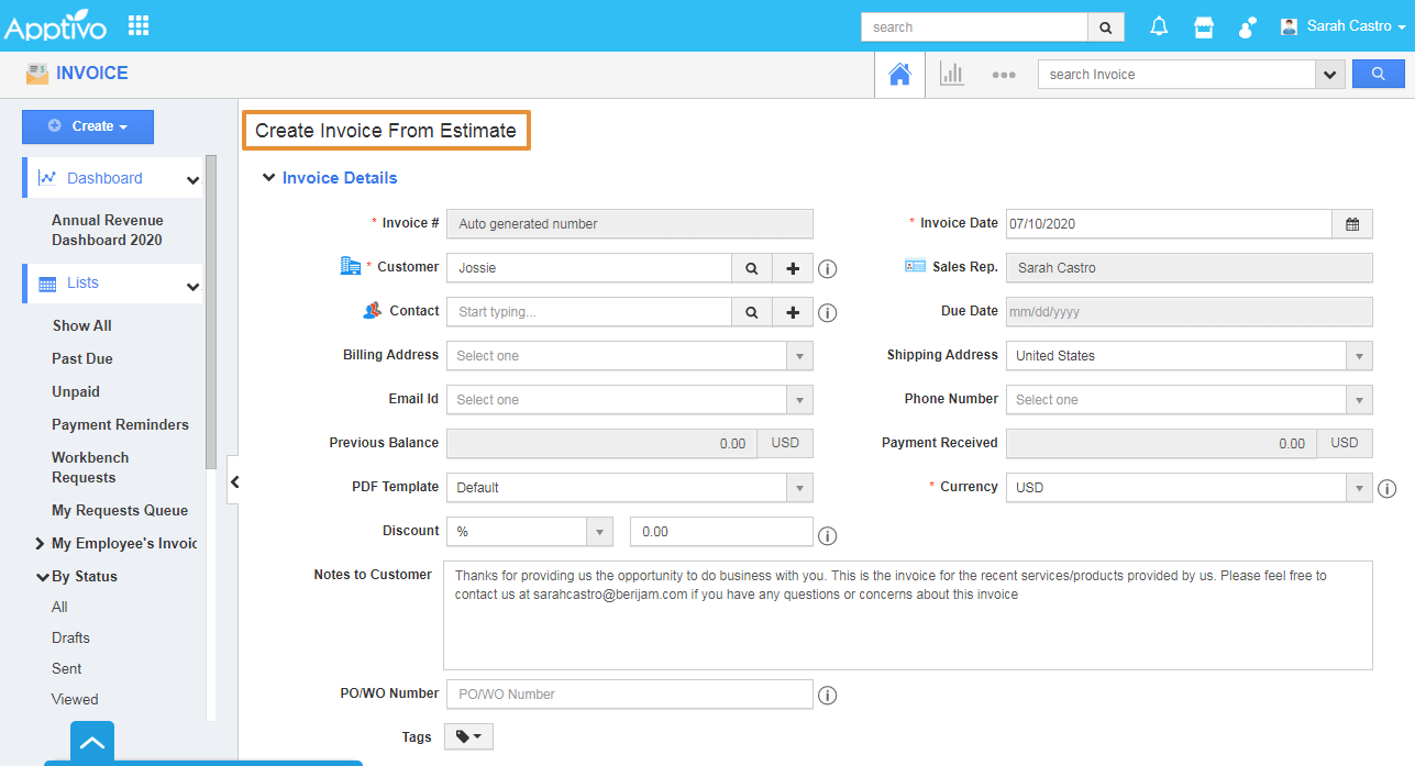 - You will be directly redirected to the Create Invoice from the Estimate page with the auto-populated mapped attributes from the estimates app.