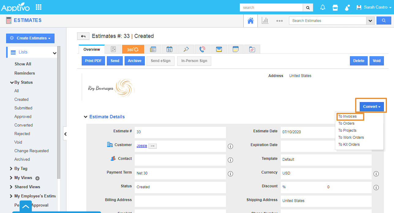 Steps to convert an Estimates to Invoice