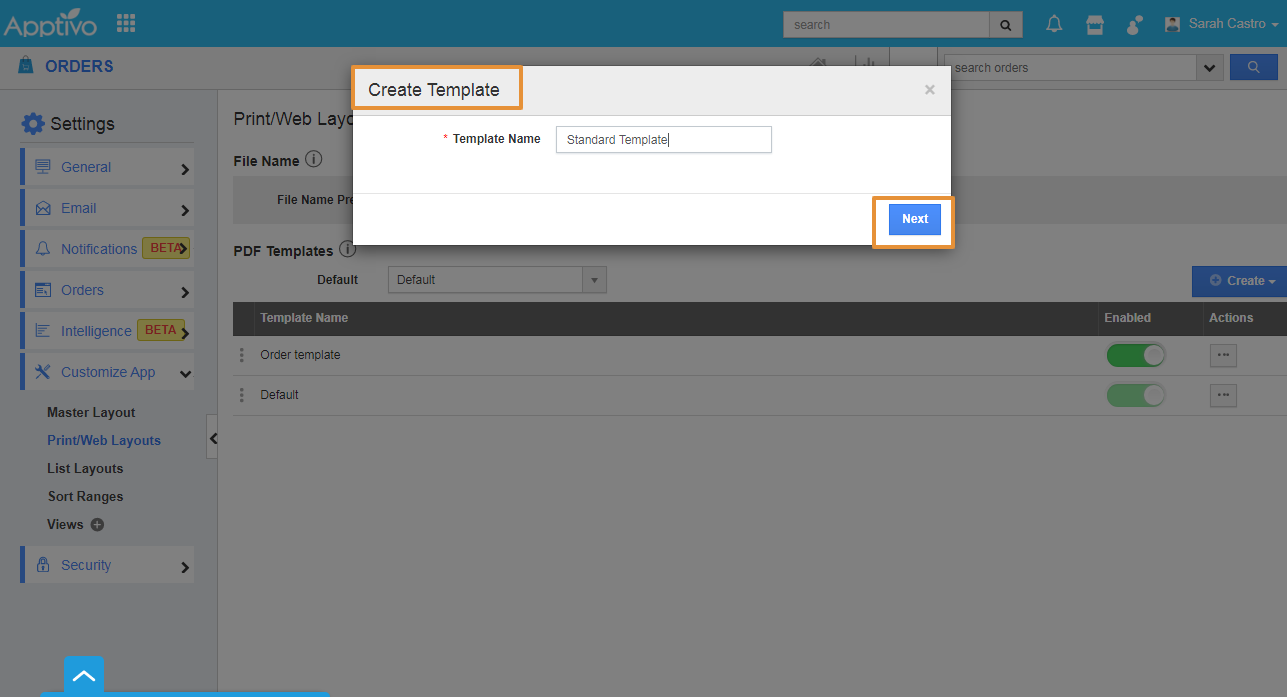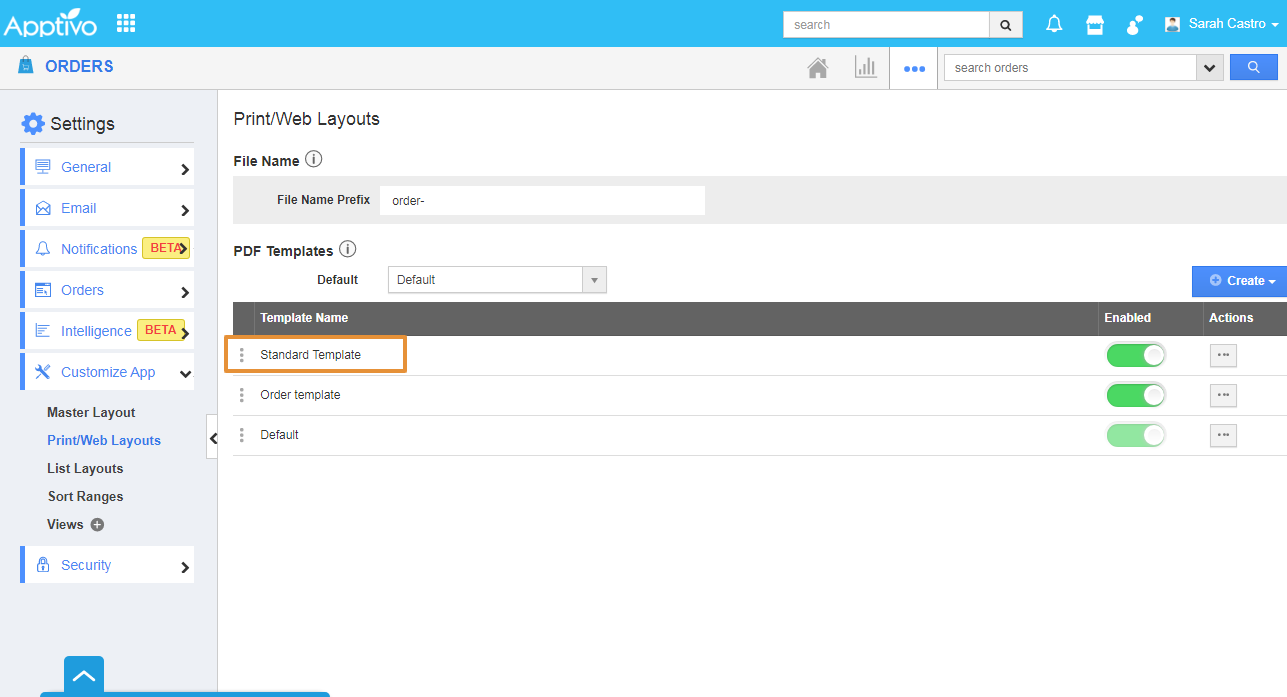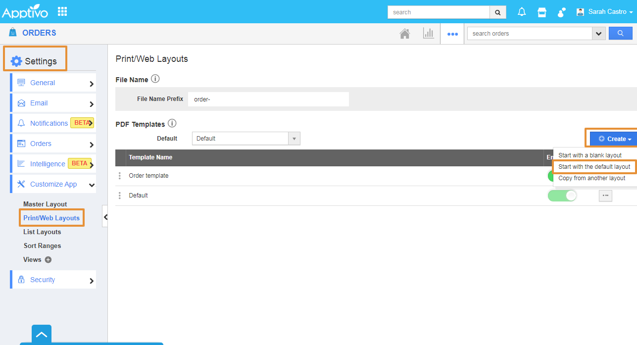 - In the Settings page, click on the Customize App and select Print/Web Layout.