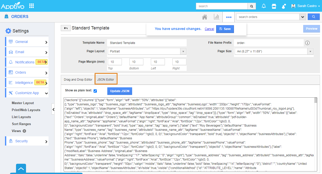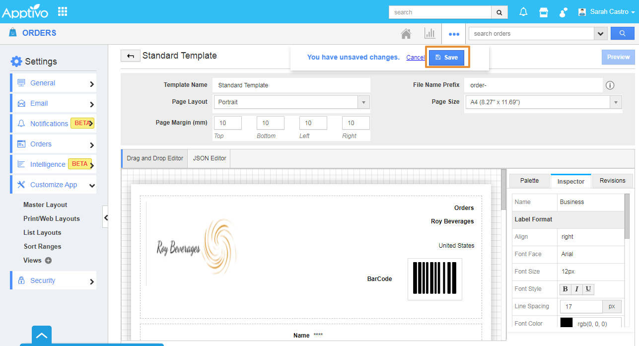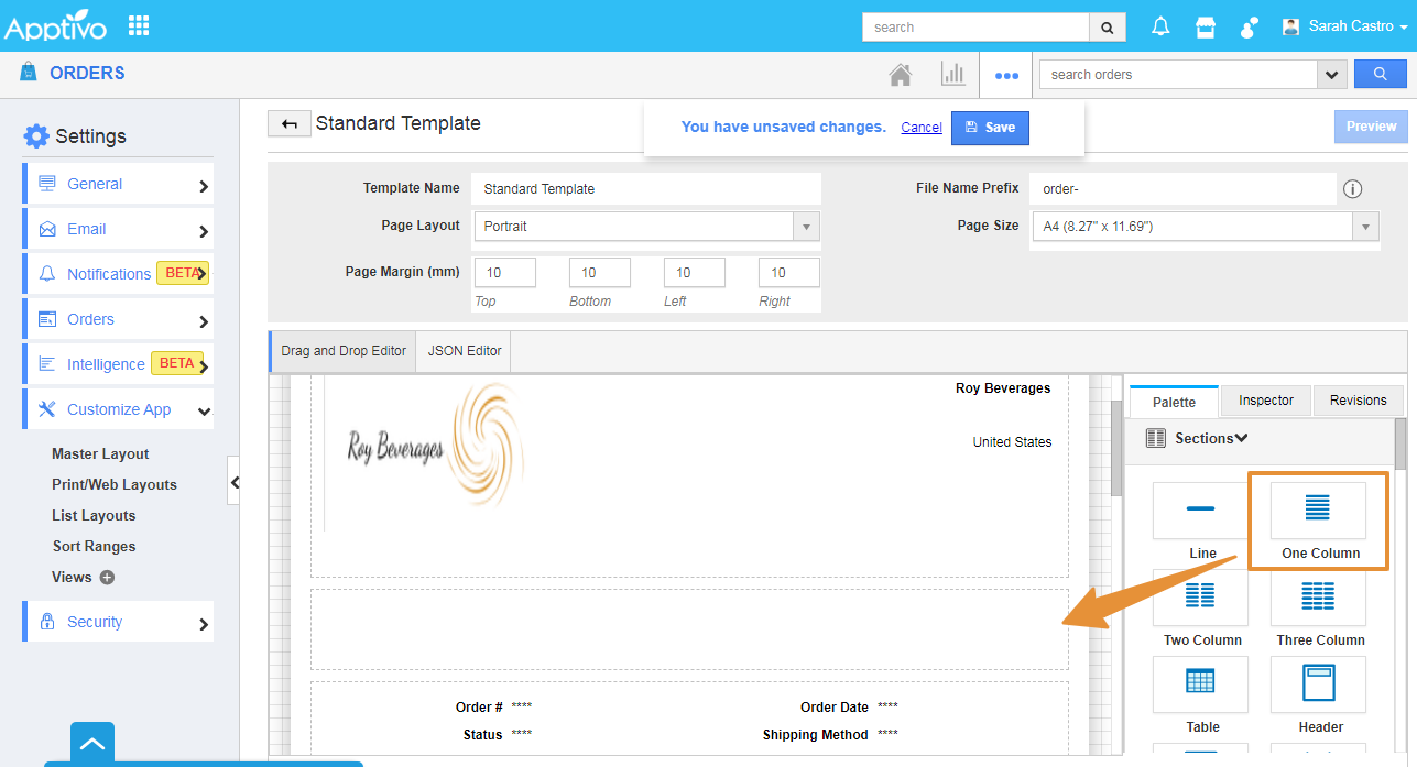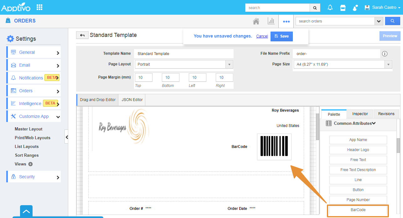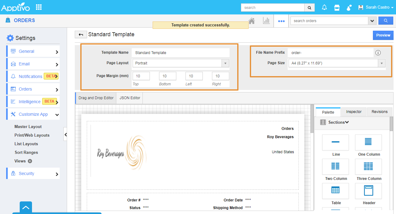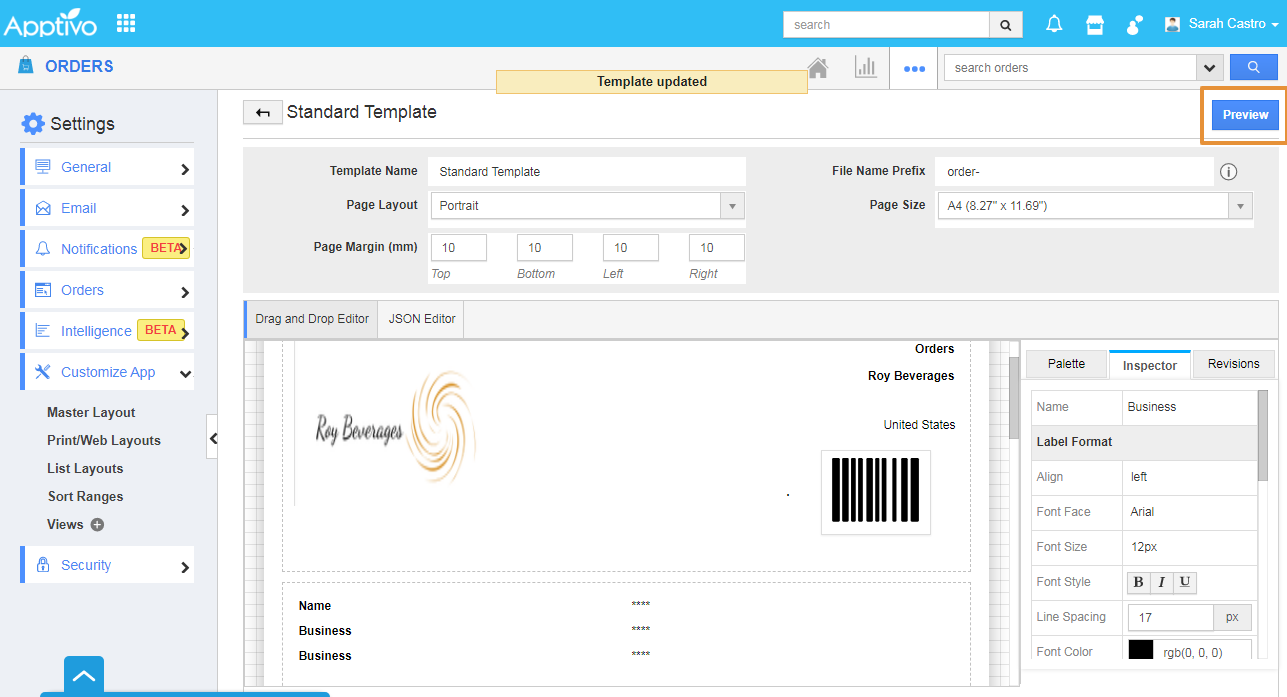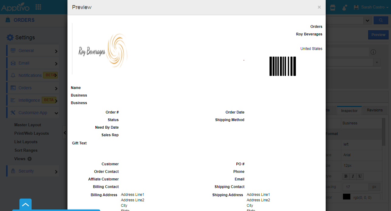 - With the following tabs like Sections, Business attributes, Customer attributes, Order attributes you can customize the template according to your preferences.