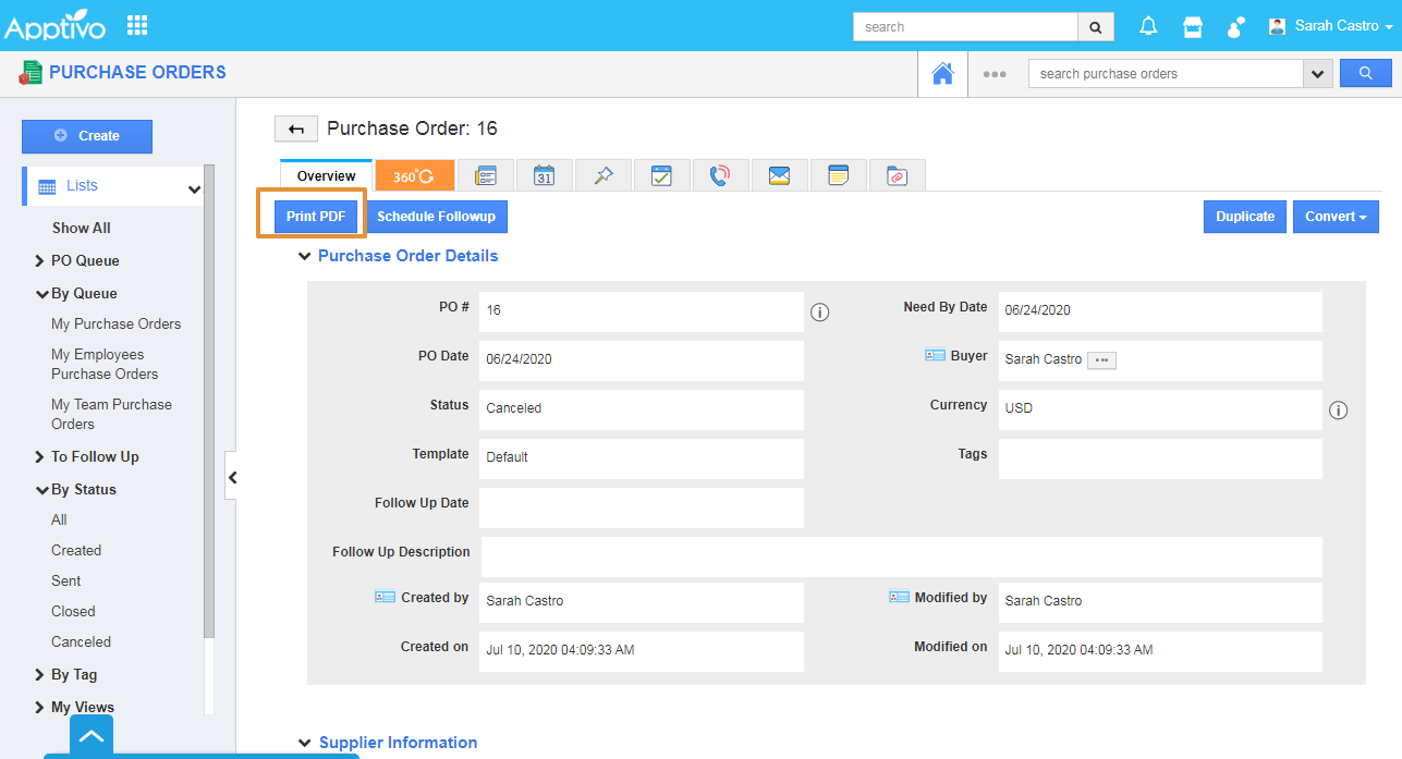 You can overview a Purchase Order which is created. In the overview page, you can view the "Print PDF" option which allows you to print a purchase order.